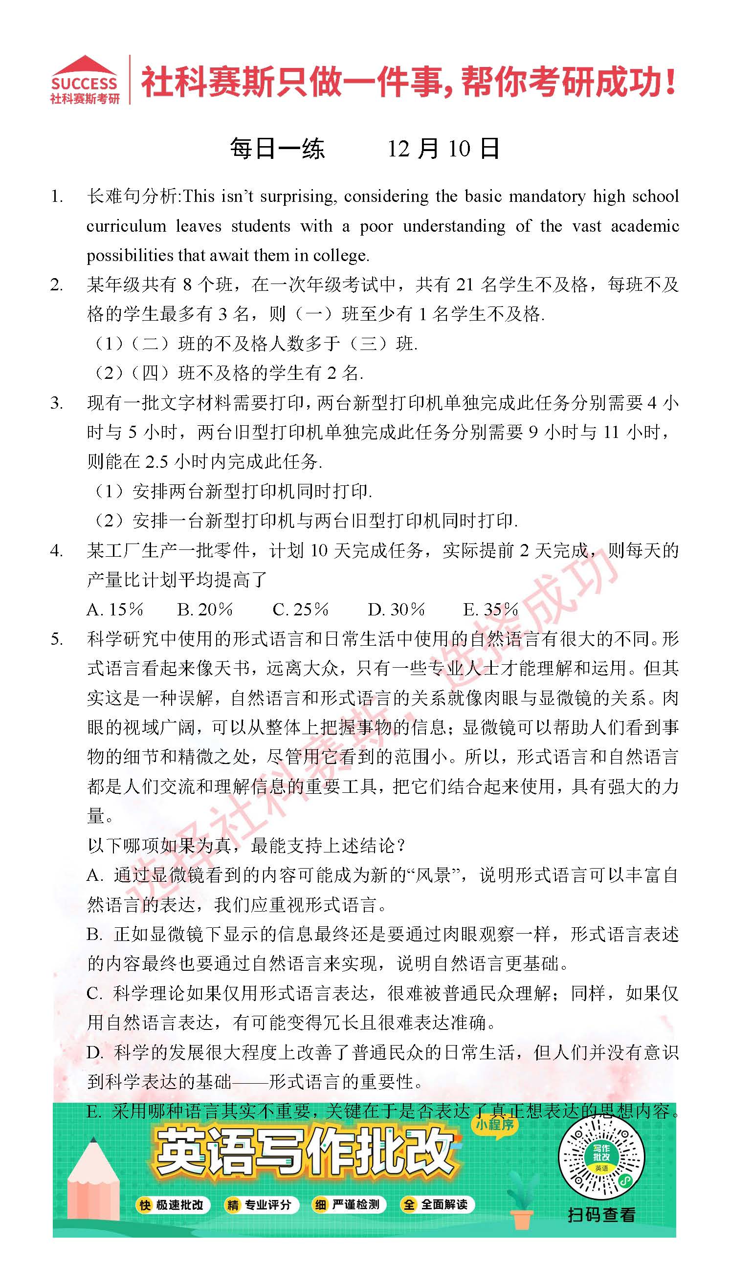導讀:考研是一場持久戰,保持良好的學習習慣,是能確保復習高效的關鍵。今天社科賽斯MBA備考網小編整理了“2021管理類聯12月10日每日一練及答案”的內容,希望能對廣大考生有所幫助。