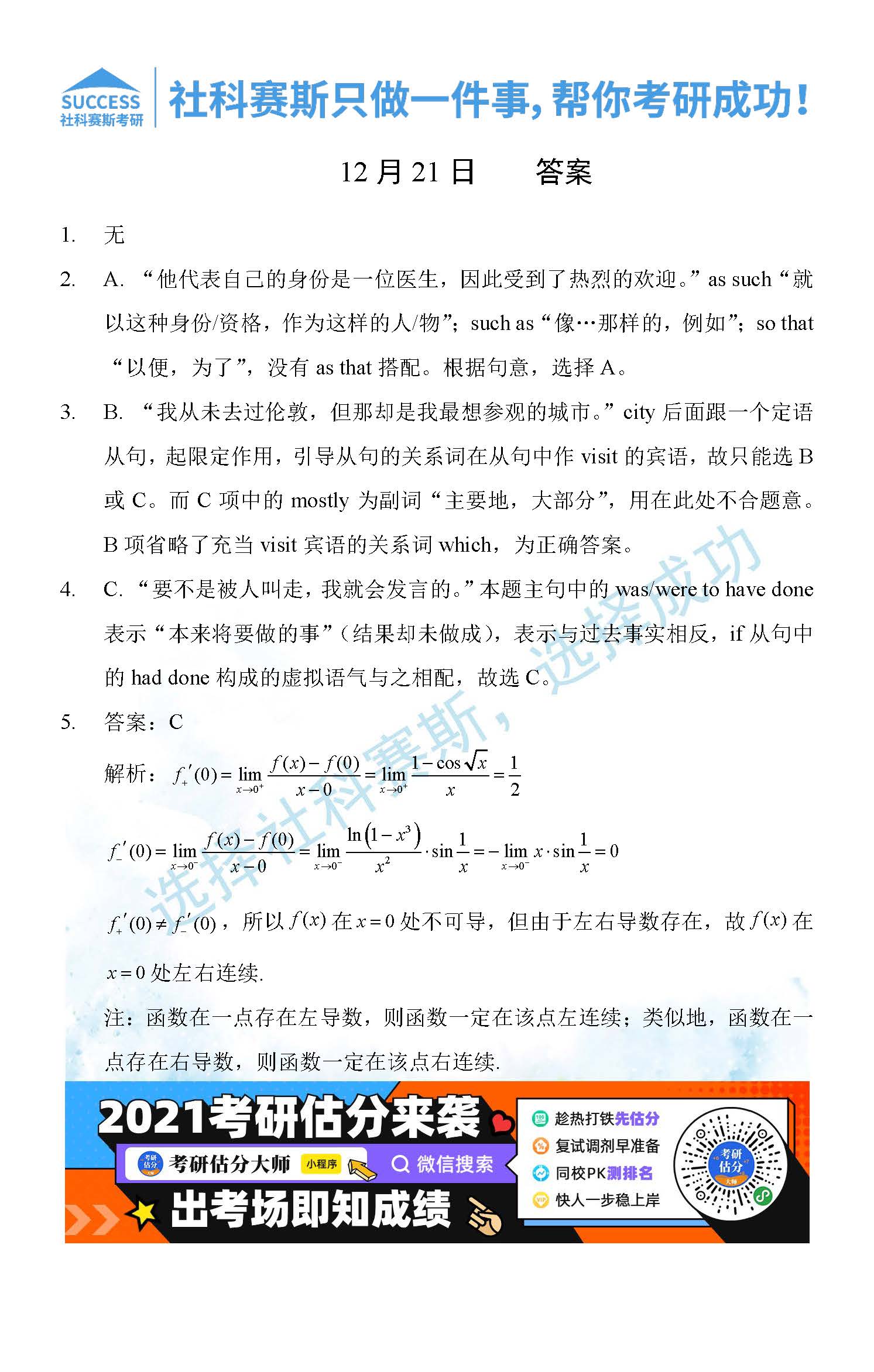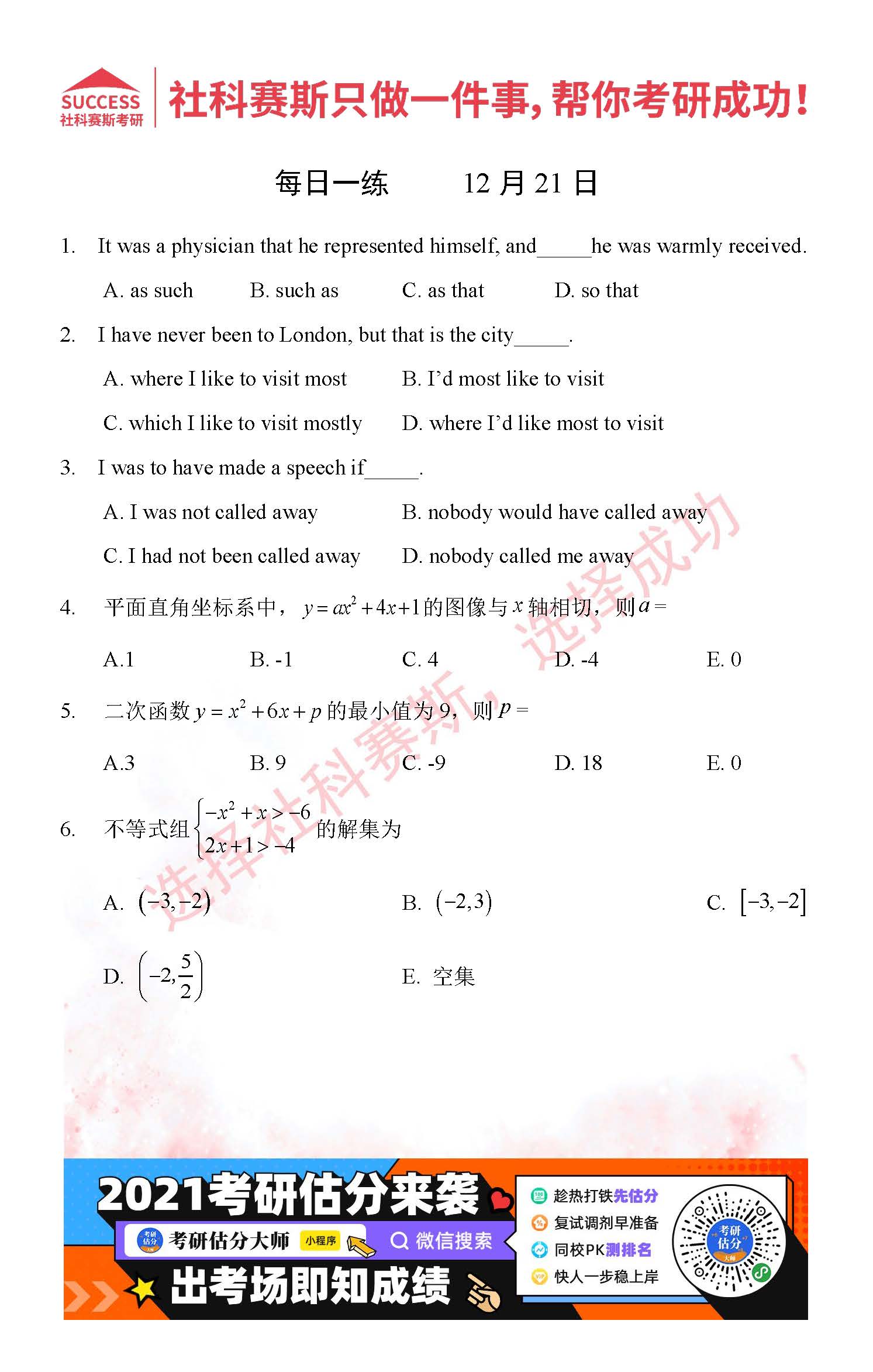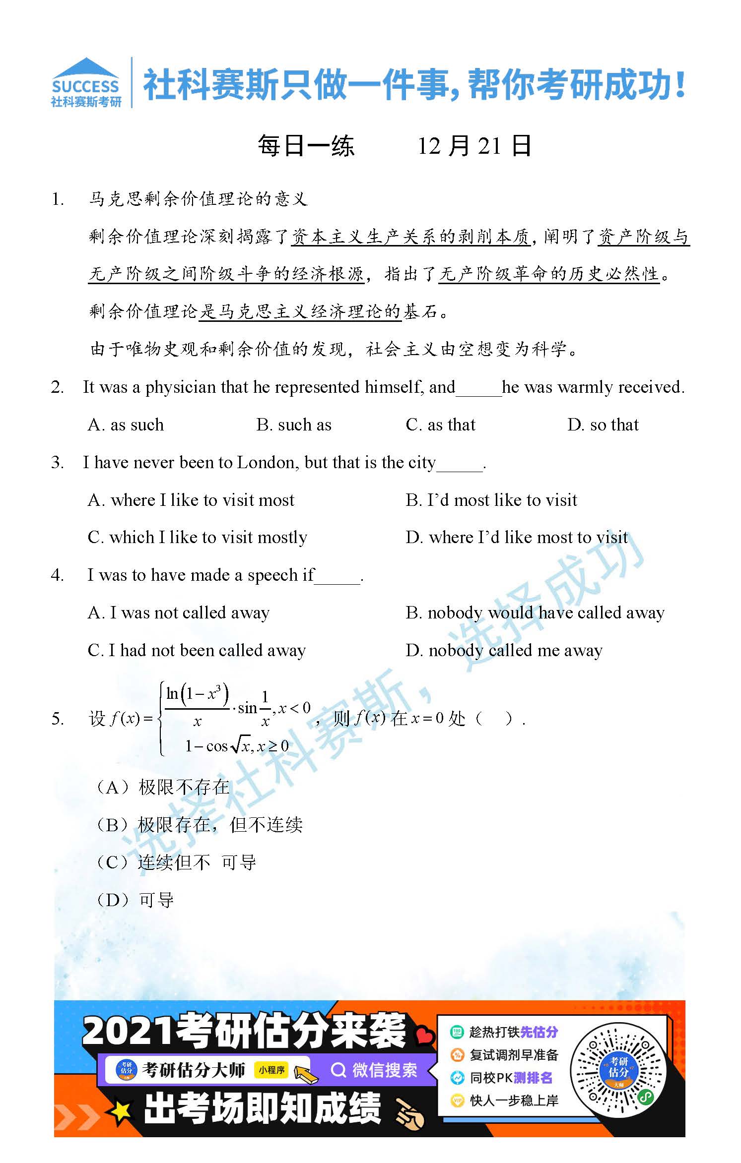導讀:考研是一場持久戰,保持良好的學習習慣,是能確保復習高效的關鍵。今天社科賽斯MBA備考網小編整理了“2021管理類聯12月21日每日一練及答案”的內容,希望能對廣大考生有所幫助。