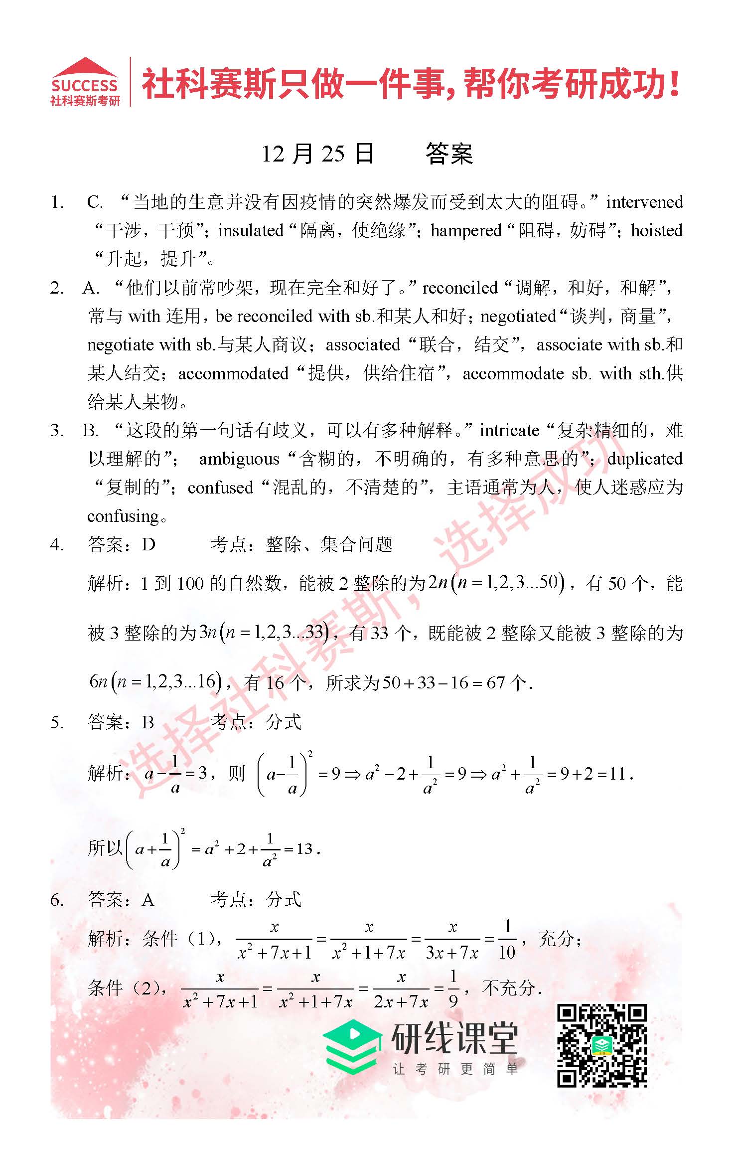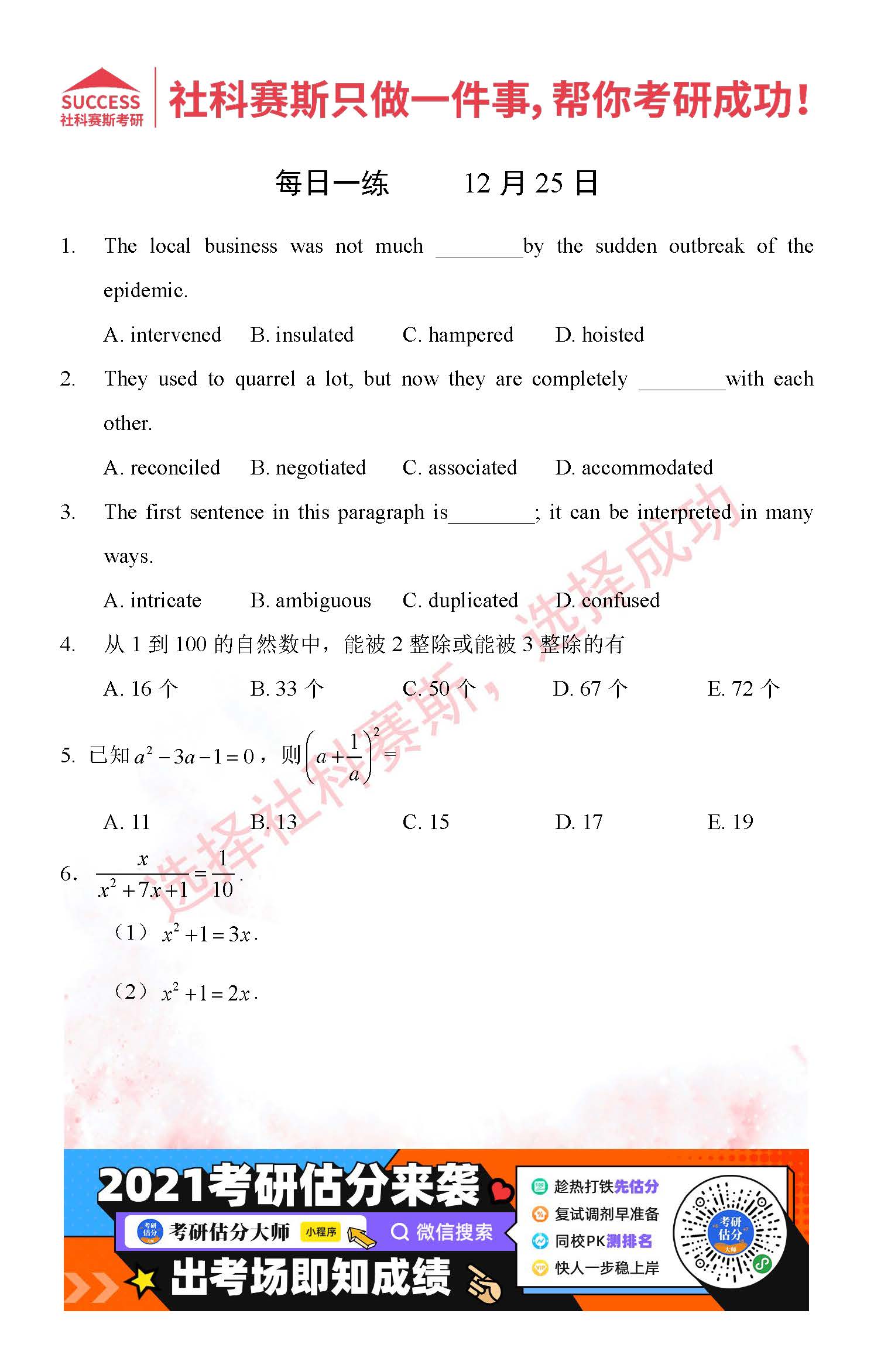 導(dǎo)讀:考研是一場持久戰(zhàn),保持良好的學(xué)習(xí)習(xí)慣,是能確保復(fù)習(xí)高效的關(guān)鍵。今天社科賽斯MBA備考網(wǎng)小編整理了“2021管理類聯(lián)12月25日每日一練及答案”的內(nèi)容,希望能對廣大考生有所幫助。