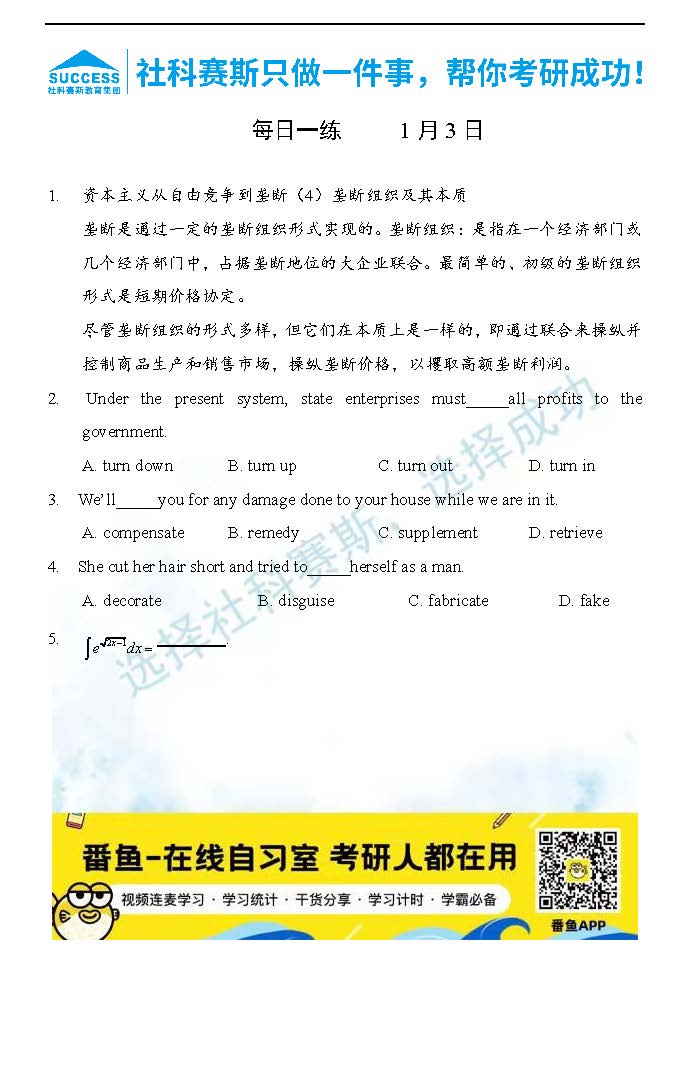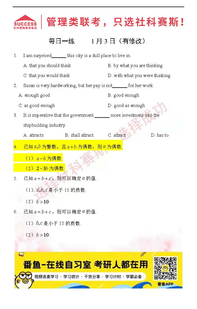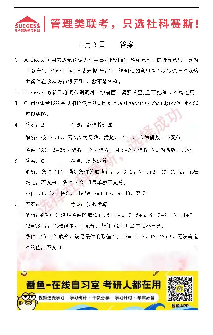 導(dǎo)讀:考研是一場(chǎng)持久戰(zhàn),保持良好的學(xué)習(xí)習(xí)慣,是能確保復(fù)習(xí)高效的關(guān)鍵。今天社科賽斯MBA備考網(wǎng)小編整理了“2022管理類聯(lián)1月3日每日一練及答案”的內(nèi)容,希望能對(duì)廣大考生有所幫助。