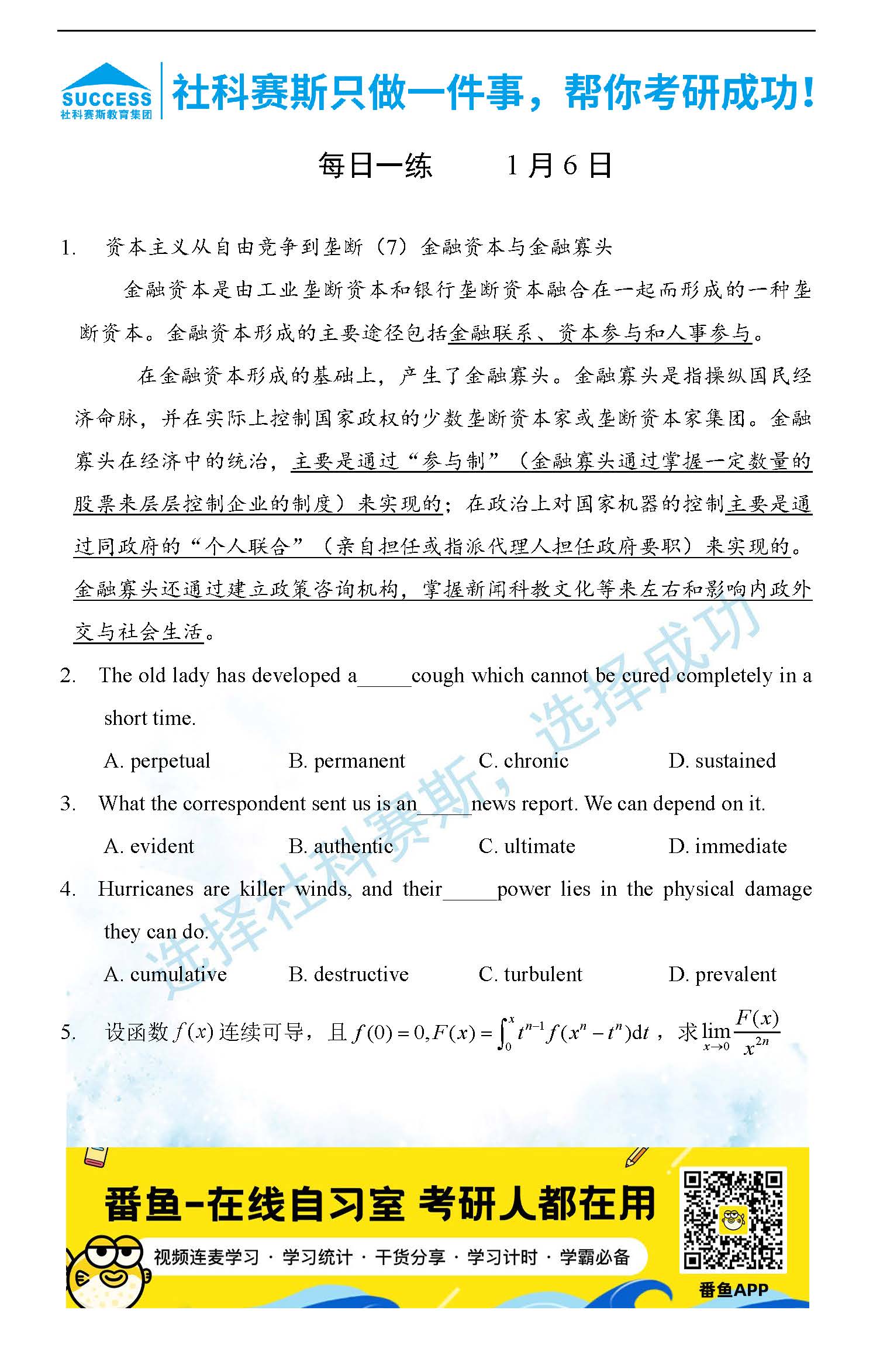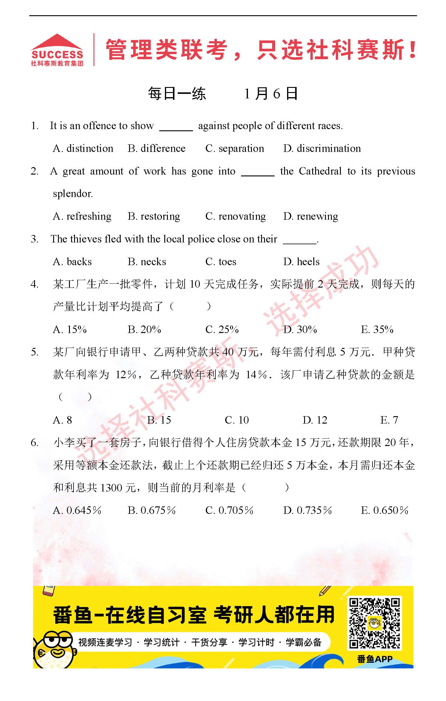 導(dǎo)讀:考研是一場(chǎng)持久戰(zhàn),保持良好的學(xué)習(xí)習(xí)慣,是能確保復(fù)習(xí)高效的關(guān)鍵。今天社科賽斯MBA備考網(wǎng)小編整理了“2022管理類聯(lián)1月6日每日一練及答案”的內(nèi)容,希望能對(duì)廣大考生有所幫助。