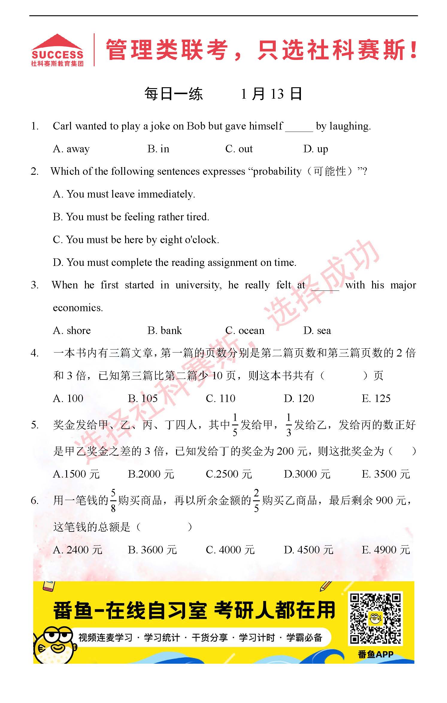 導讀:考研是一場持久戰,保持良好的學習習慣,是能確保復習高效的關鍵。今天社科賽斯MBA備考網小編整理了“2022管理類聯1月13日每日一練及答案”的內容,希望能對廣大考生有所幫助。