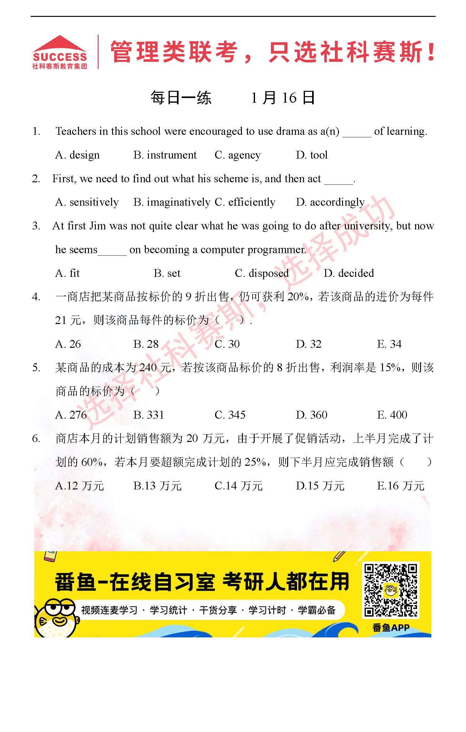 導(dǎo)讀:考研是一場(chǎng)持久戰(zhàn),保持良好的學(xué)習(xí)習(xí)慣,是能確保復(fù)習(xí)高效的關(guān)鍵。今天社科賽斯MBA備考網(wǎng)小編整理了“2022管理類(lèi)聯(lián)1月16日每日一練及答案”的內(nèi)容,希望能對(duì)廣大考生有所幫助。