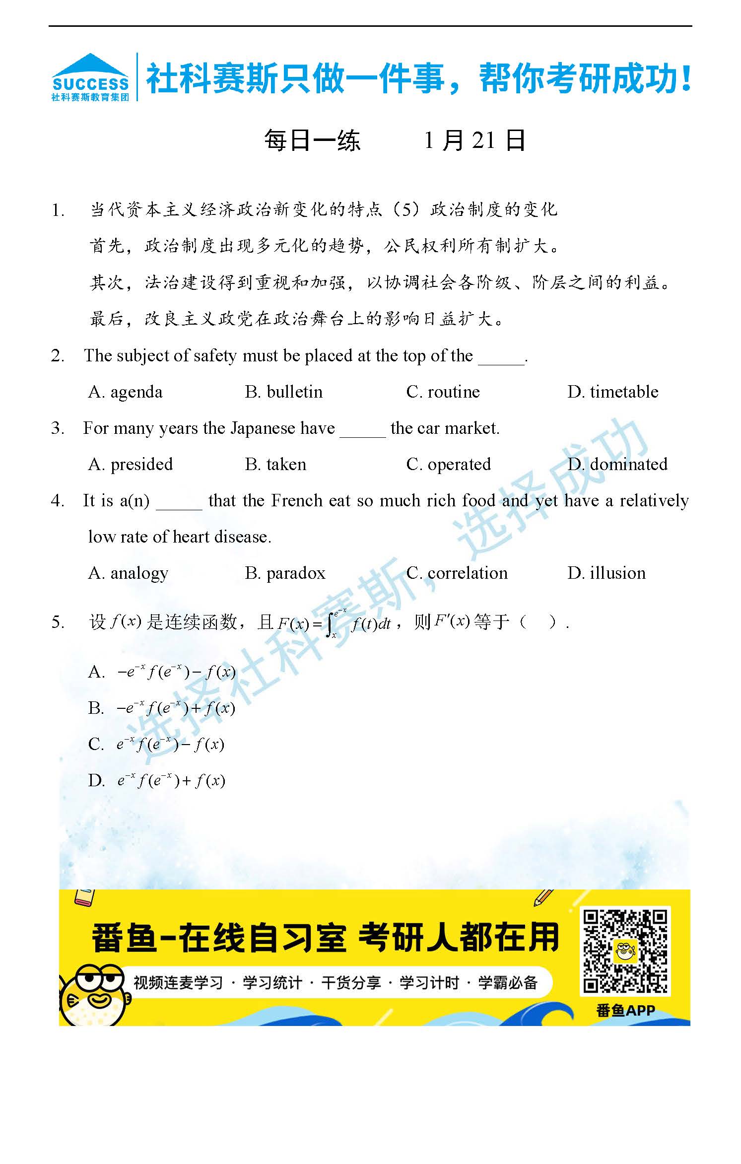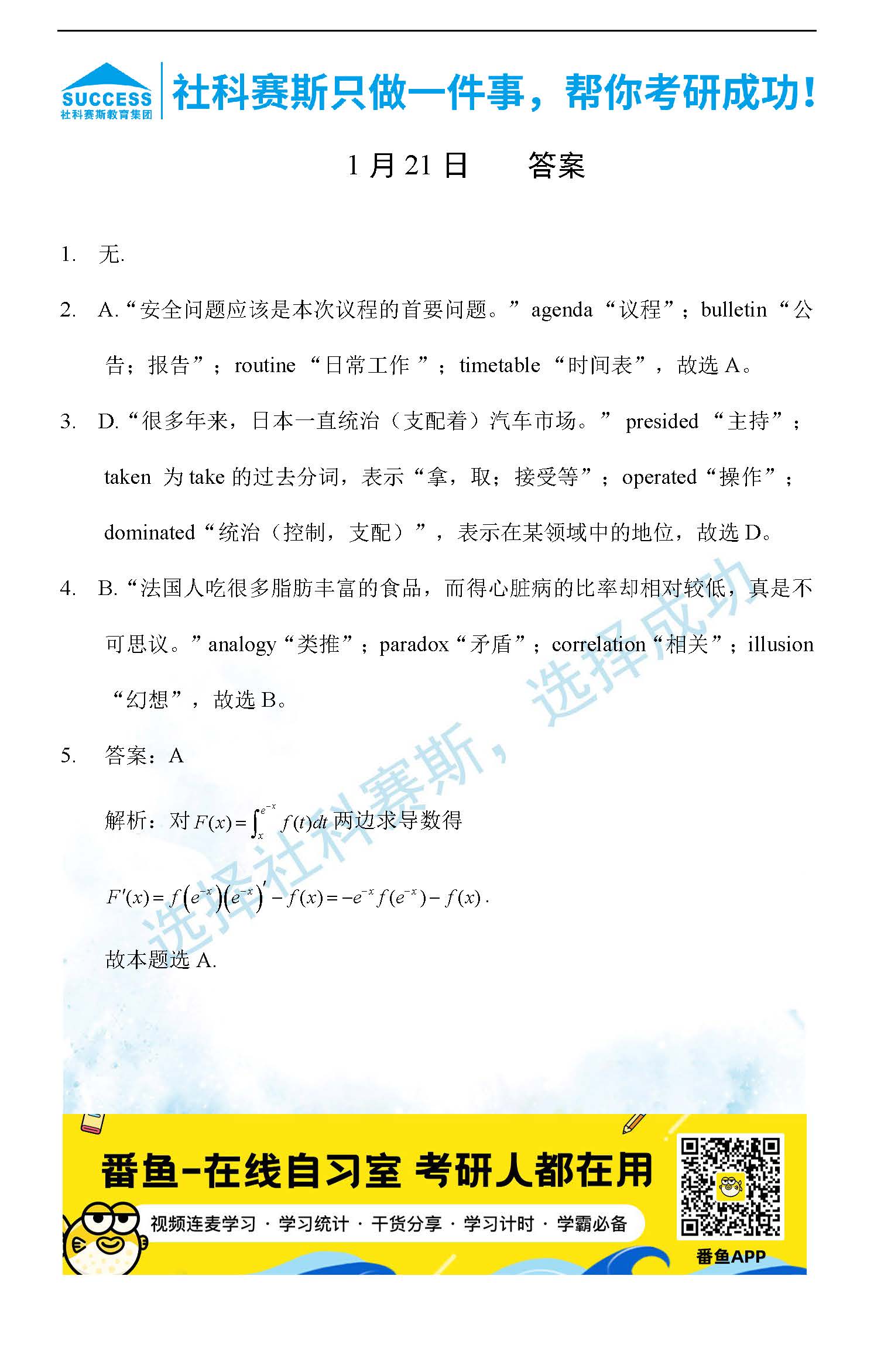 導(dǎo)讀:考研是一場持久戰(zhàn),保持良好的學(xué)習(xí)習(xí)慣,是能確保復(fù)習(xí)高效的關(guān)鍵。今天社科賽斯MBA備考網(wǎng)小編整理了“2022管理類聯(lián)1月21日每日一練及答案”的內(nèi)容,希望能對廣大考生有所幫助。