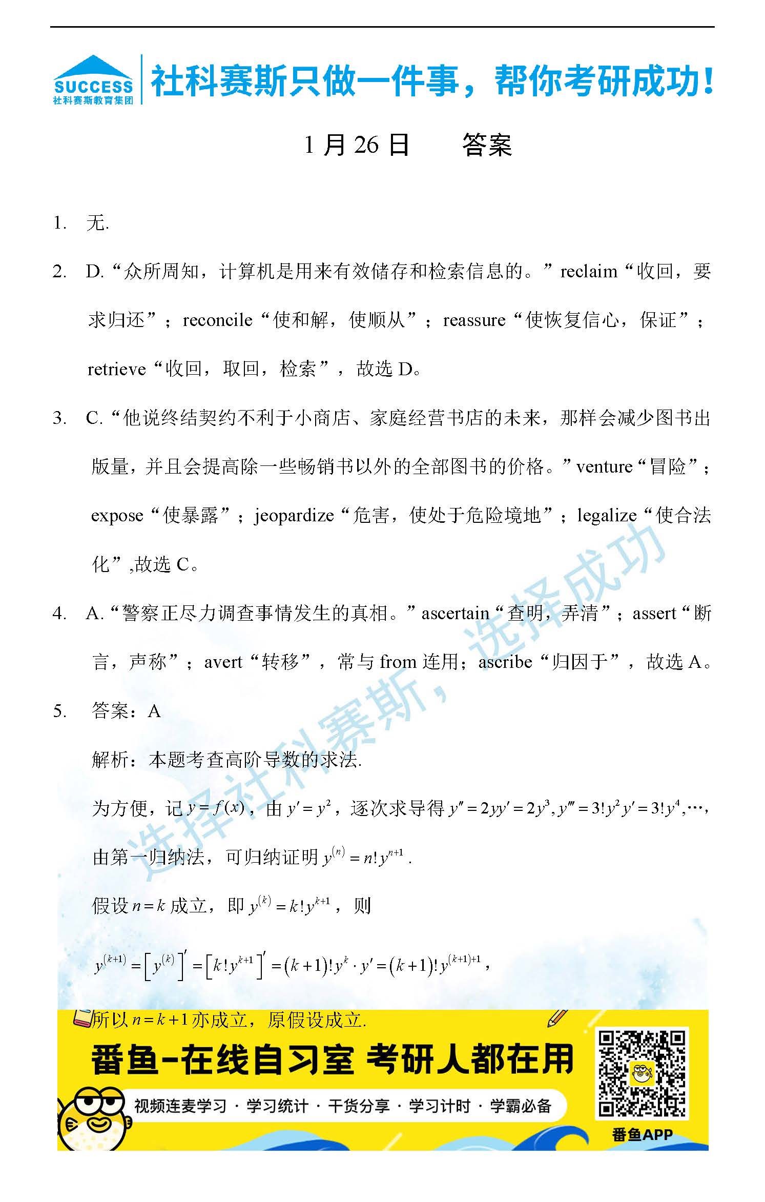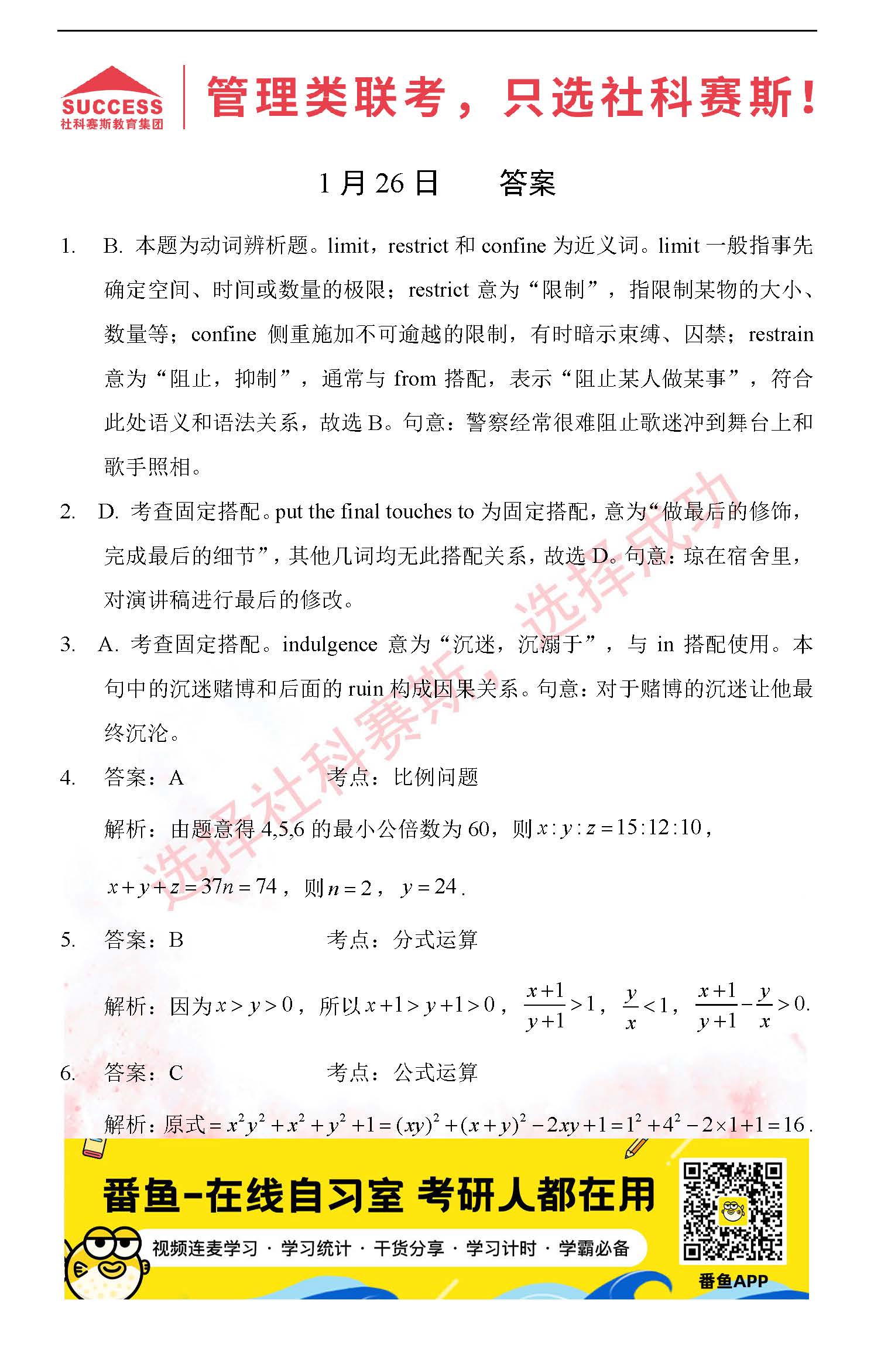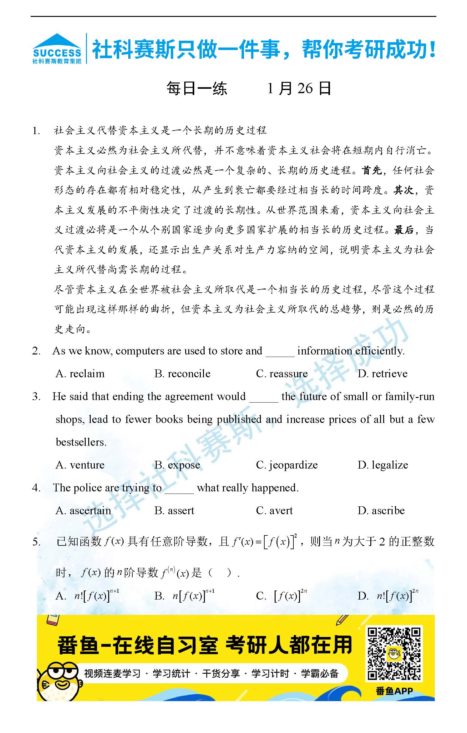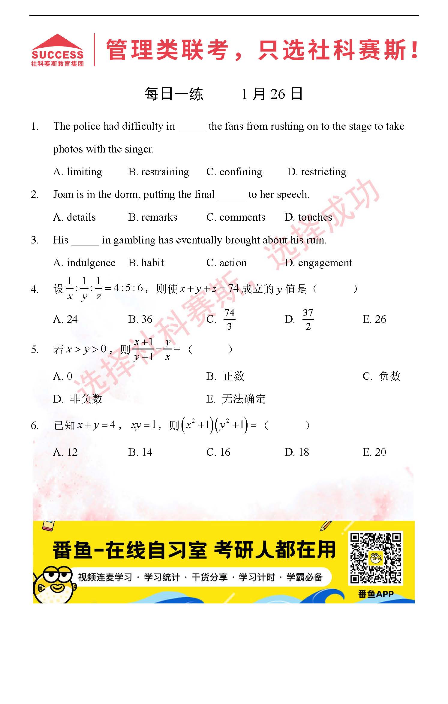 導(dǎo)讀:考研是一場(chǎng)持久戰(zhàn),保持良好的學(xué)習(xí)習(xí)慣,是能確保復(fù)習(xí)高效的關(guān)鍵。今天社科賽斯MBA備考網(wǎng)小編整理了“2022管理類聯(lián)1月26日每日一練及答案”的內(nèi)容,希望能對(duì)廣大考生有所幫助。