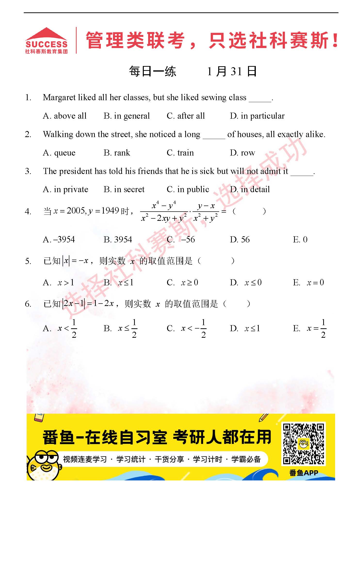 導讀:考研是一場持久戰,保持良好的學習習慣,是能確保復習高效的關鍵。今天社科賽斯MBA備考網小編整理了“2022管理類聯1月31日每日一練及答案”的內容,希望能對廣大考生有所幫助。