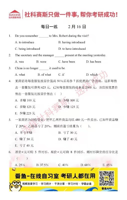 首頁> 管理類聯(lián)考每日一練 > 2022管理類聯(lián)考2月16日每日一練及答案