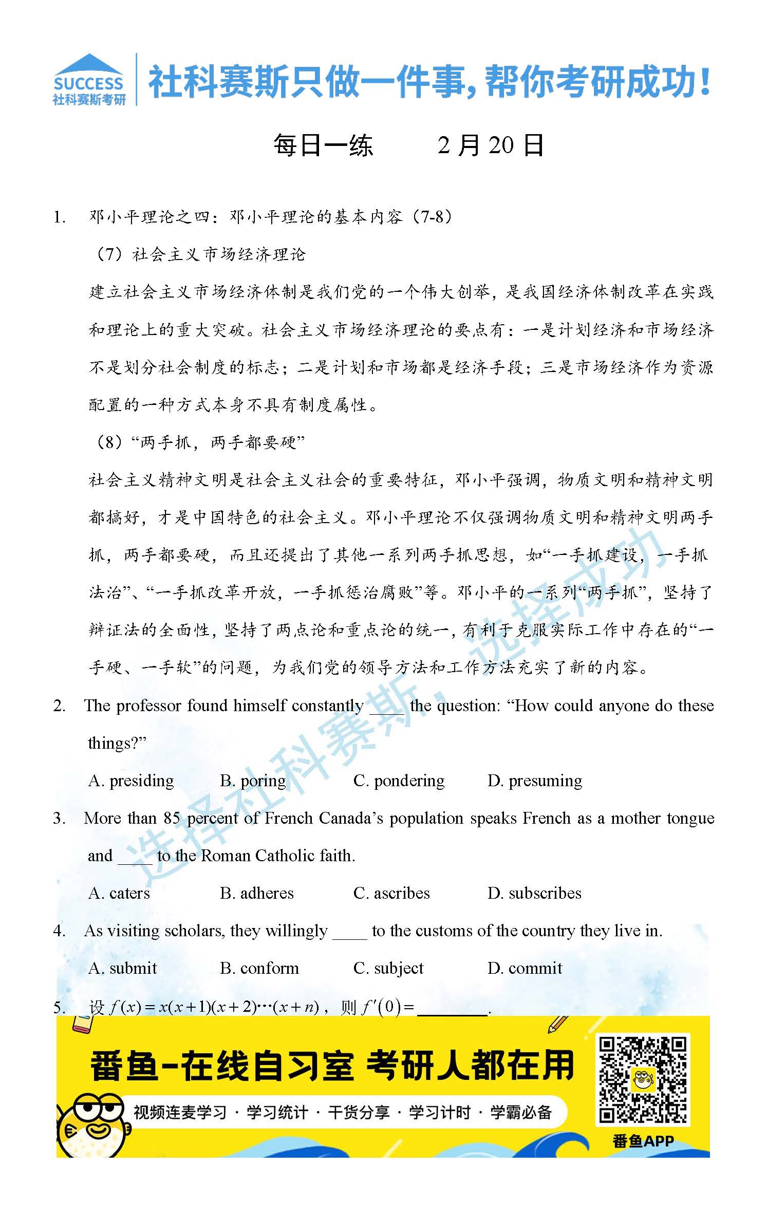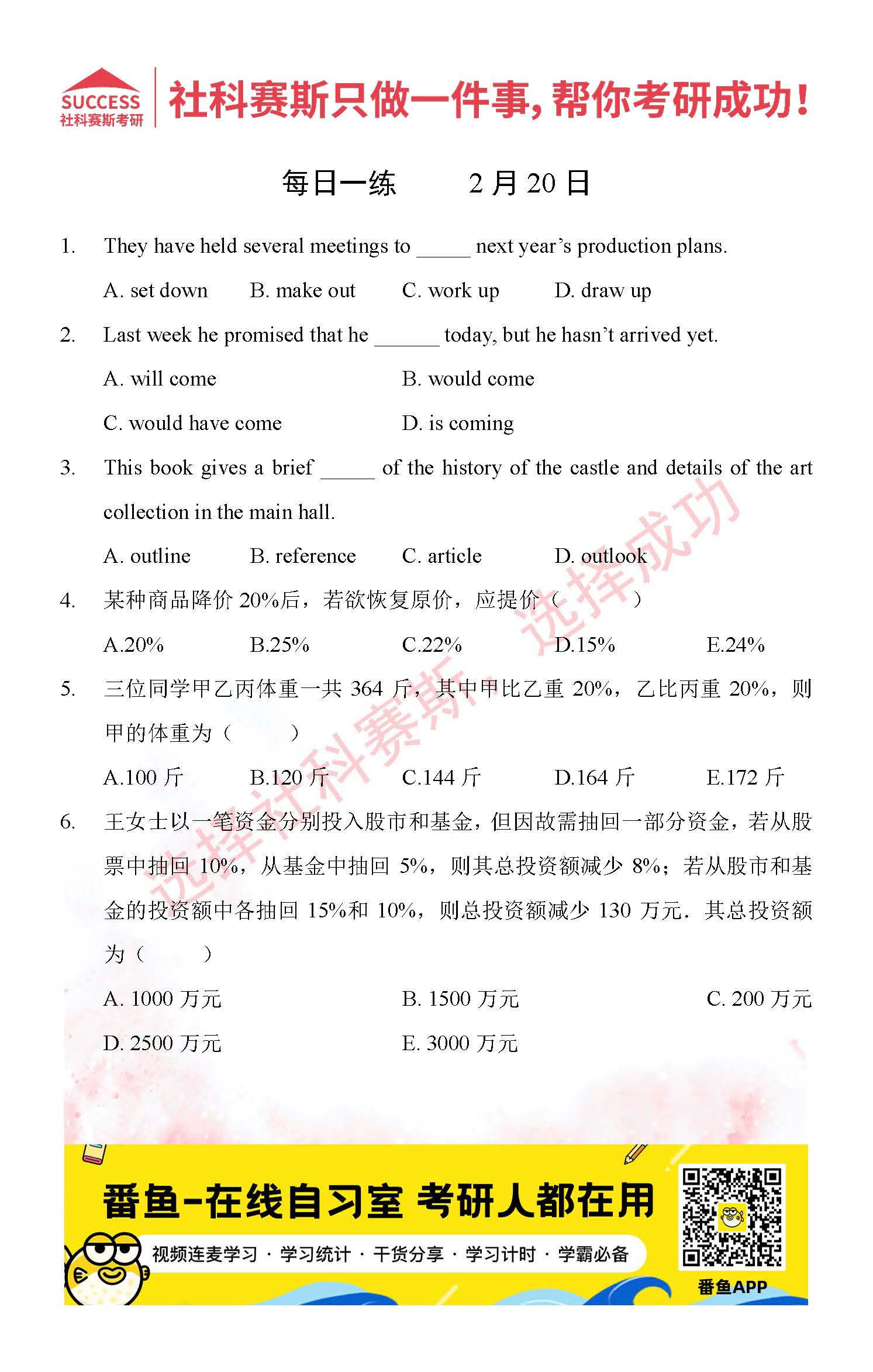 導讀:考研是一場持久戰,保持良好的學習習慣,是能確保復習高效的關鍵。今天社科賽斯MBA備考網小編整理了“2022管理類聯2月20日每日一練及答案”的內容,希望能對廣大考生有所幫助。