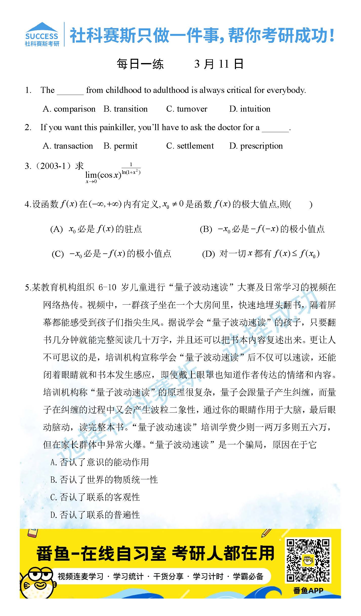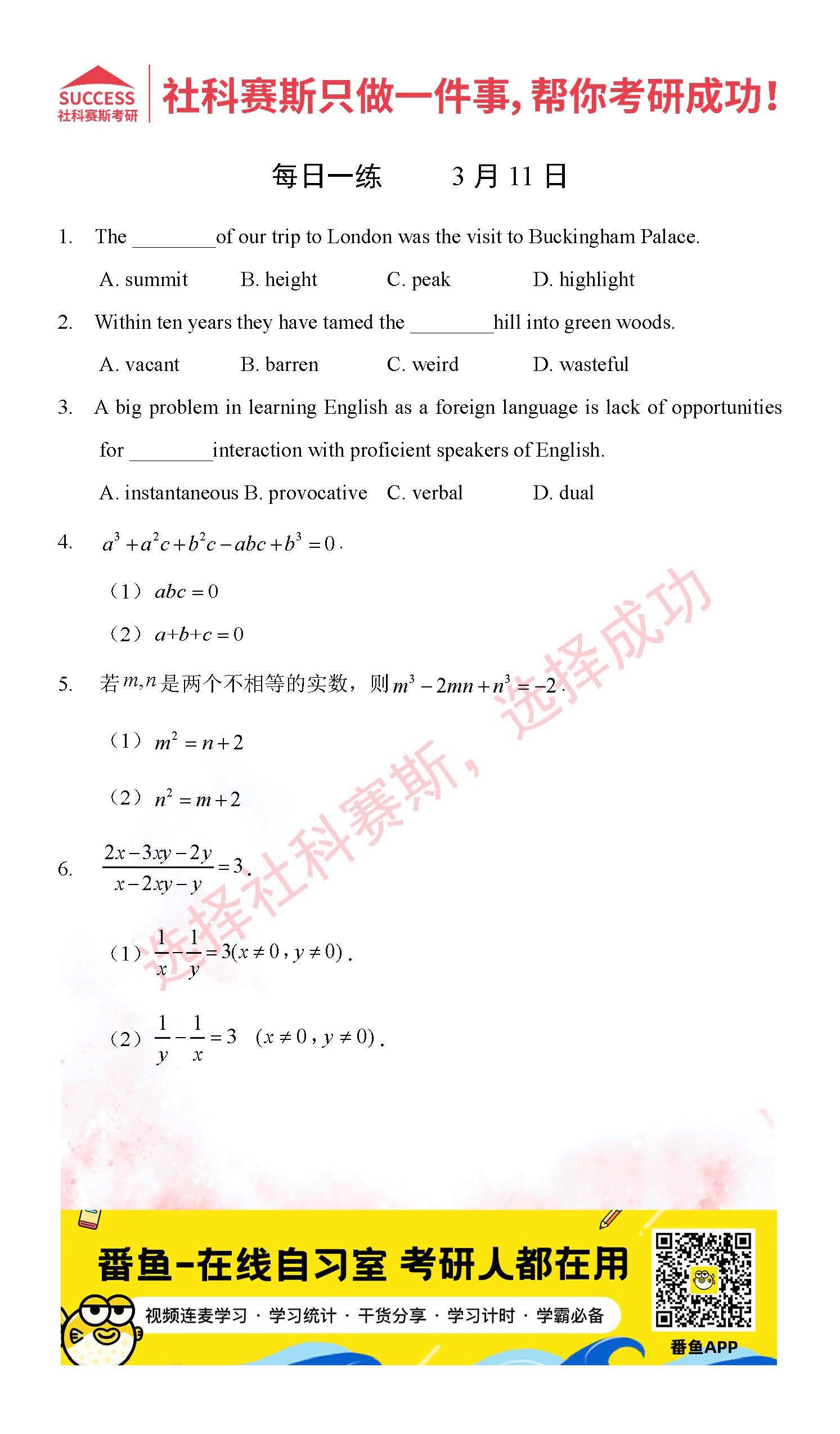 導(dǎo)讀:考研是一場持久戰(zhàn),保持良好的學(xué)習(xí)習(xí)慣,是能確保復(fù)習(xí)高效的關(guān)鍵。今天社科賽斯MBA備考網(wǎng)小編整理了“2022管理類聯(lián)3月11日每日一練及答案”的內(nèi)容,希望能對廣大考生有所幫助。
