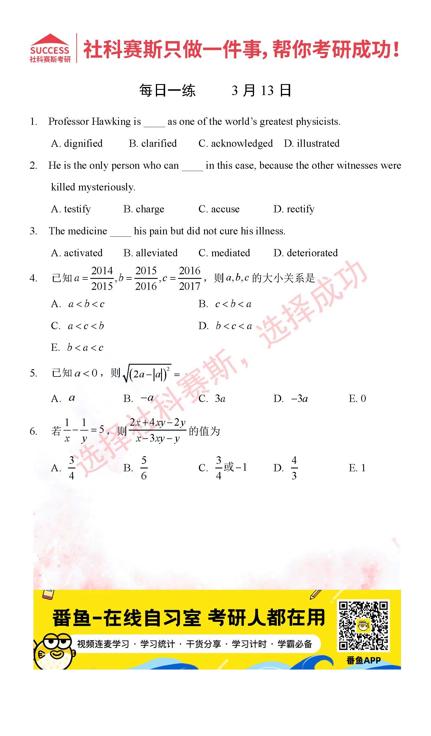 導讀:考研是一場持久戰,保持良好的學習習慣,是能確保復習高效的關鍵。今天社科賽斯MBA備考網小編整理了“2022管理類聯3月13日每日一練及答案”的內容,希望能對廣大考生有所幫助。