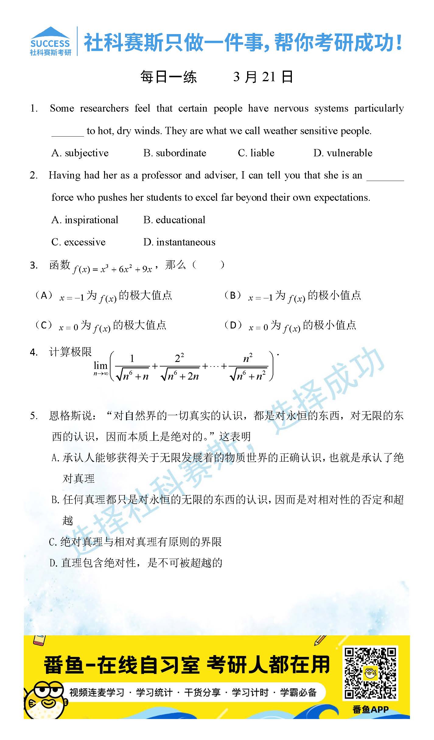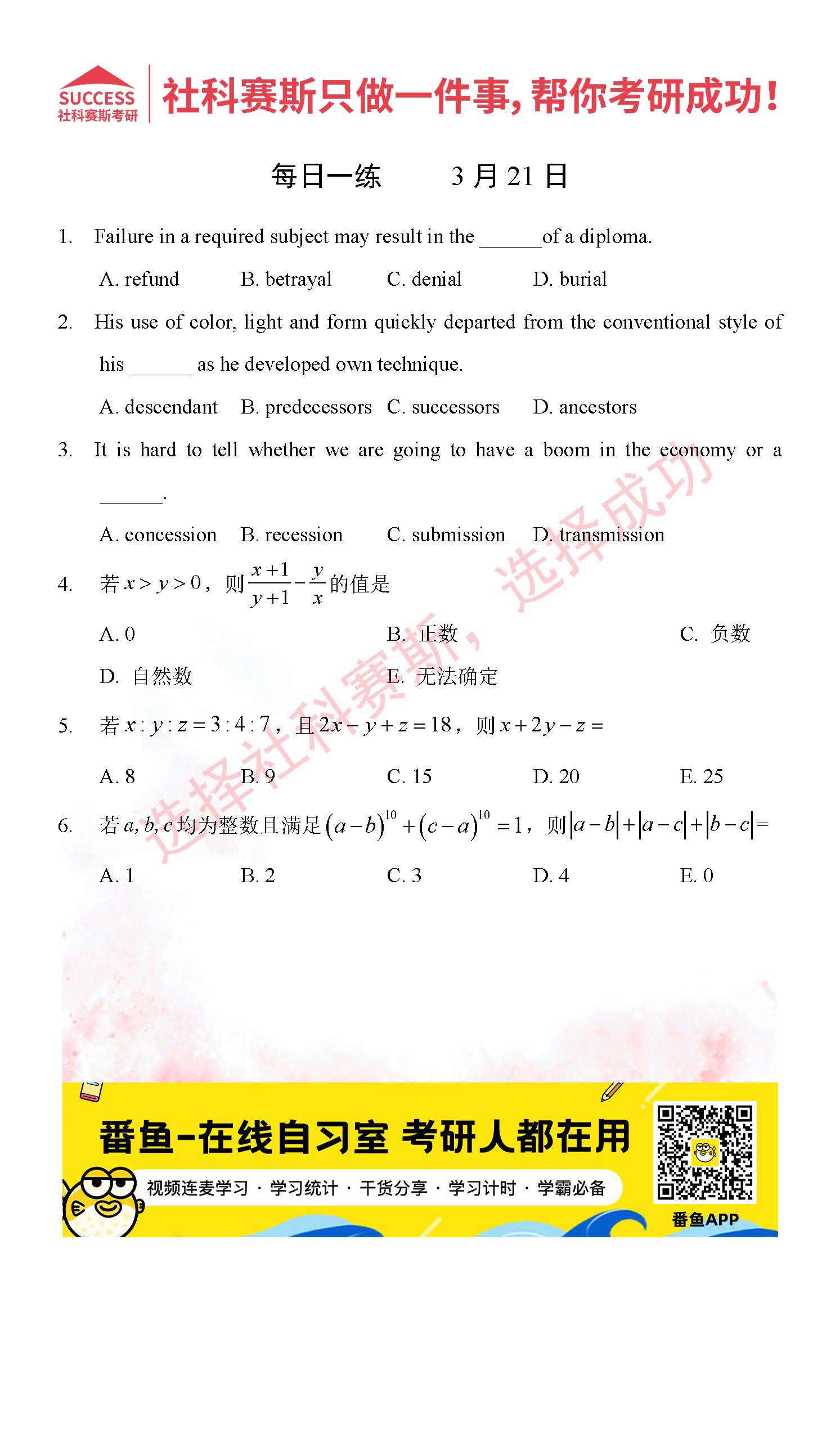 導讀:考研是一場持久戰,保持良好的學習習慣,是能確保復習高效的關鍵。今天社科賽斯MBA備考網小編整理了“2022管理類聯3月21日每日一練及答案”的內容,希望能對廣大考生有所幫助。