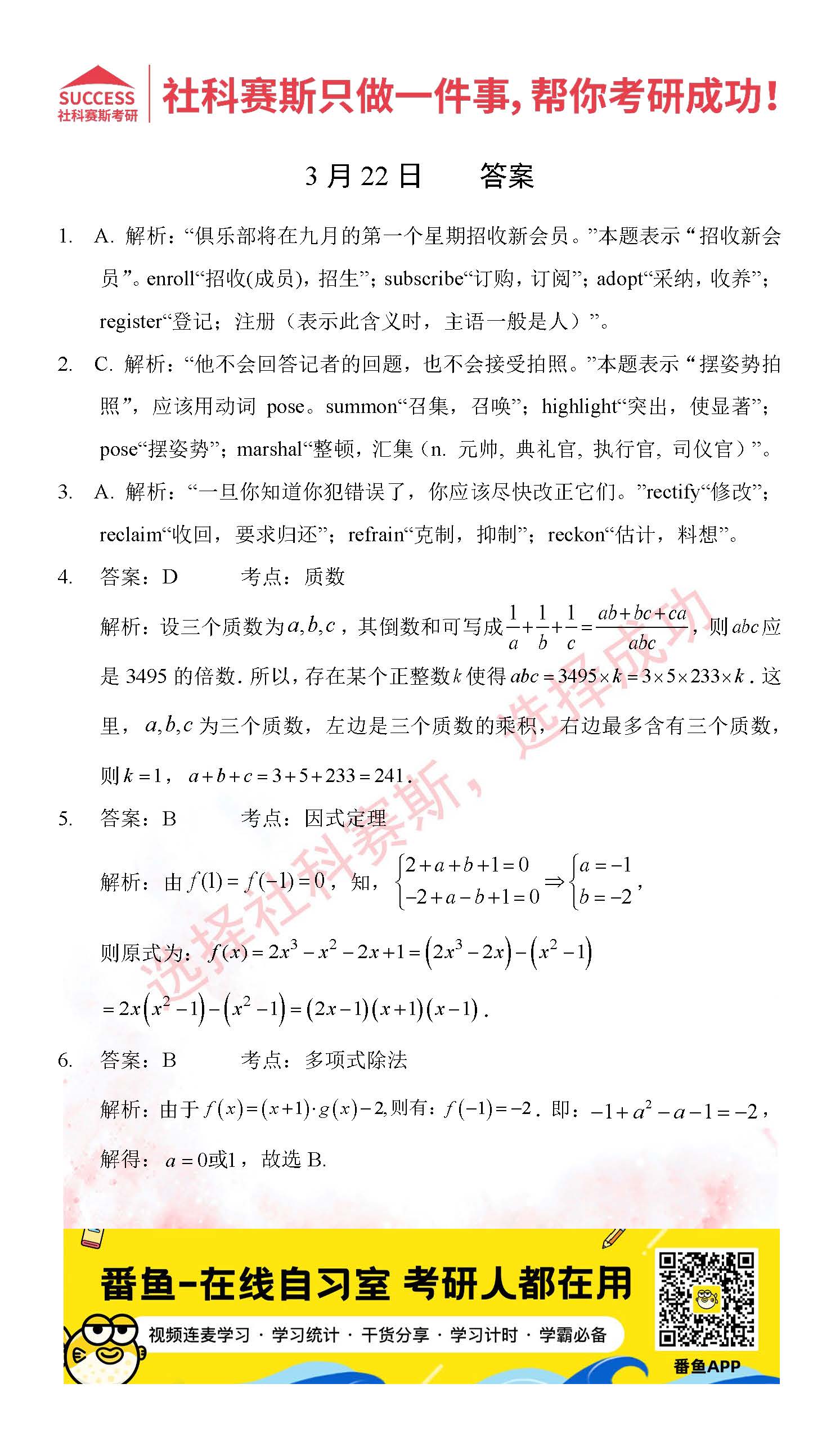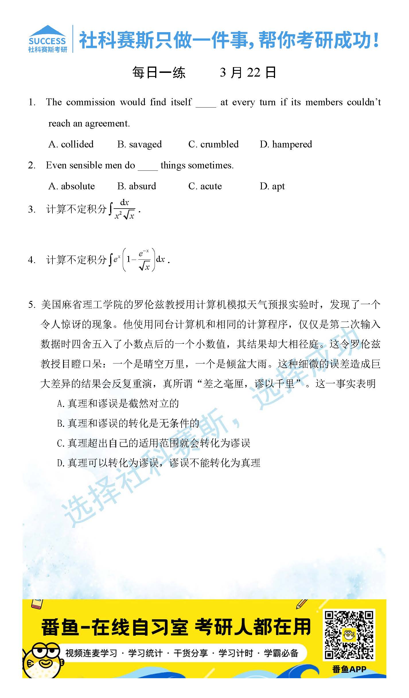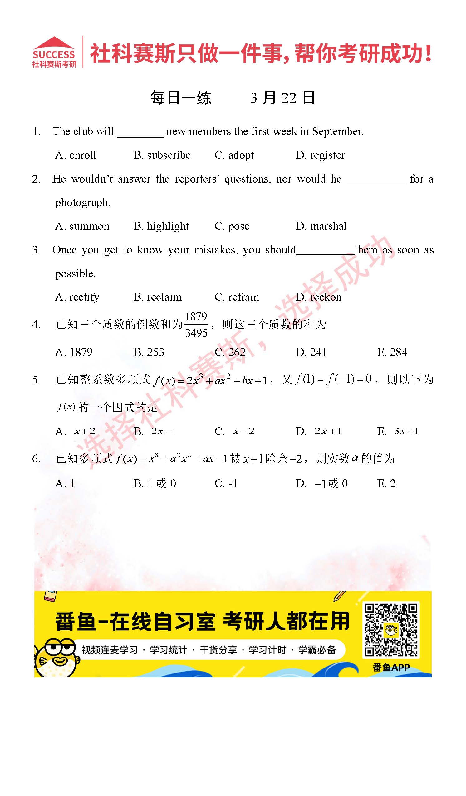 導讀:考研是一場持久戰,保持良好的學習習慣,是能確保復習高效的關鍵。今天社科賽斯MBA備考網小編整理了“2022管理類聯3月22日每日一練及答案”的內容,希望能對廣大考生有所幫助。
