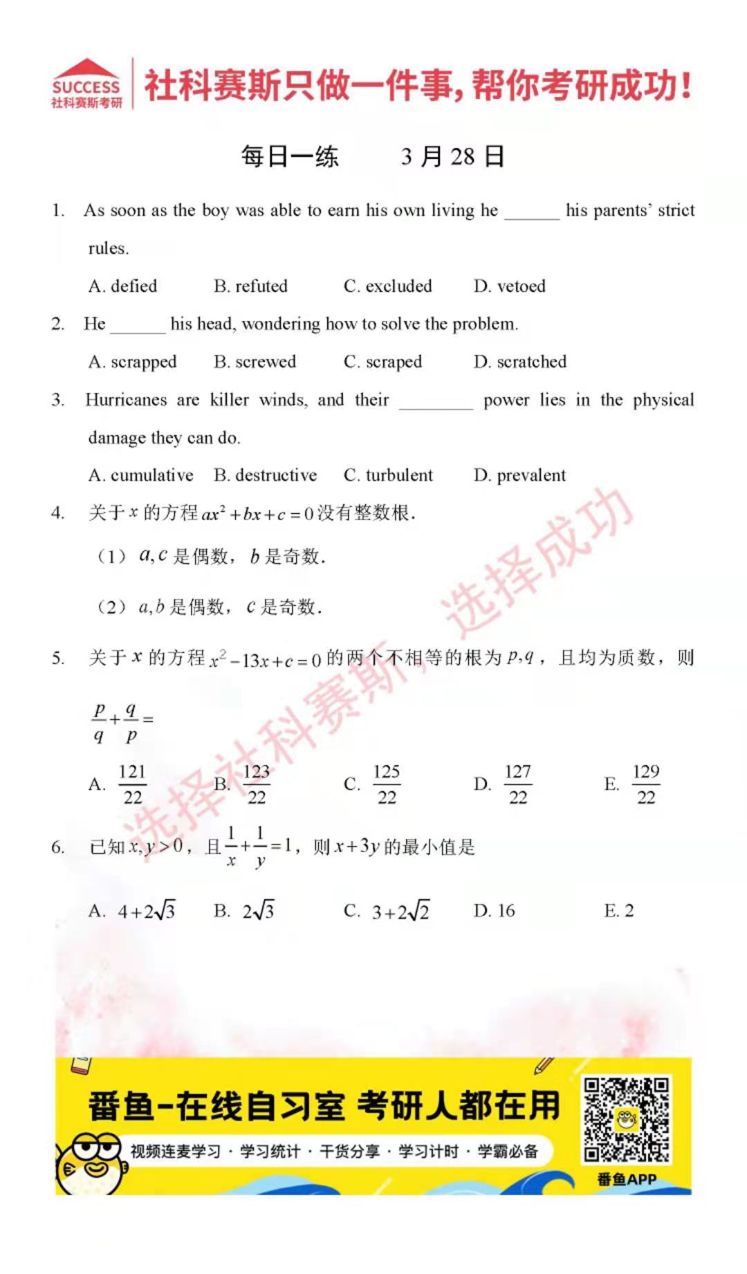 導讀:考研是一場持久戰,保持良好的學習習慣,是能確保復習高效的關鍵。今天社科賽斯MBA備考網小編整理了“2022管理類聯3月28日每日一練及答案”的內容,希望能對廣大考生有所幫助。