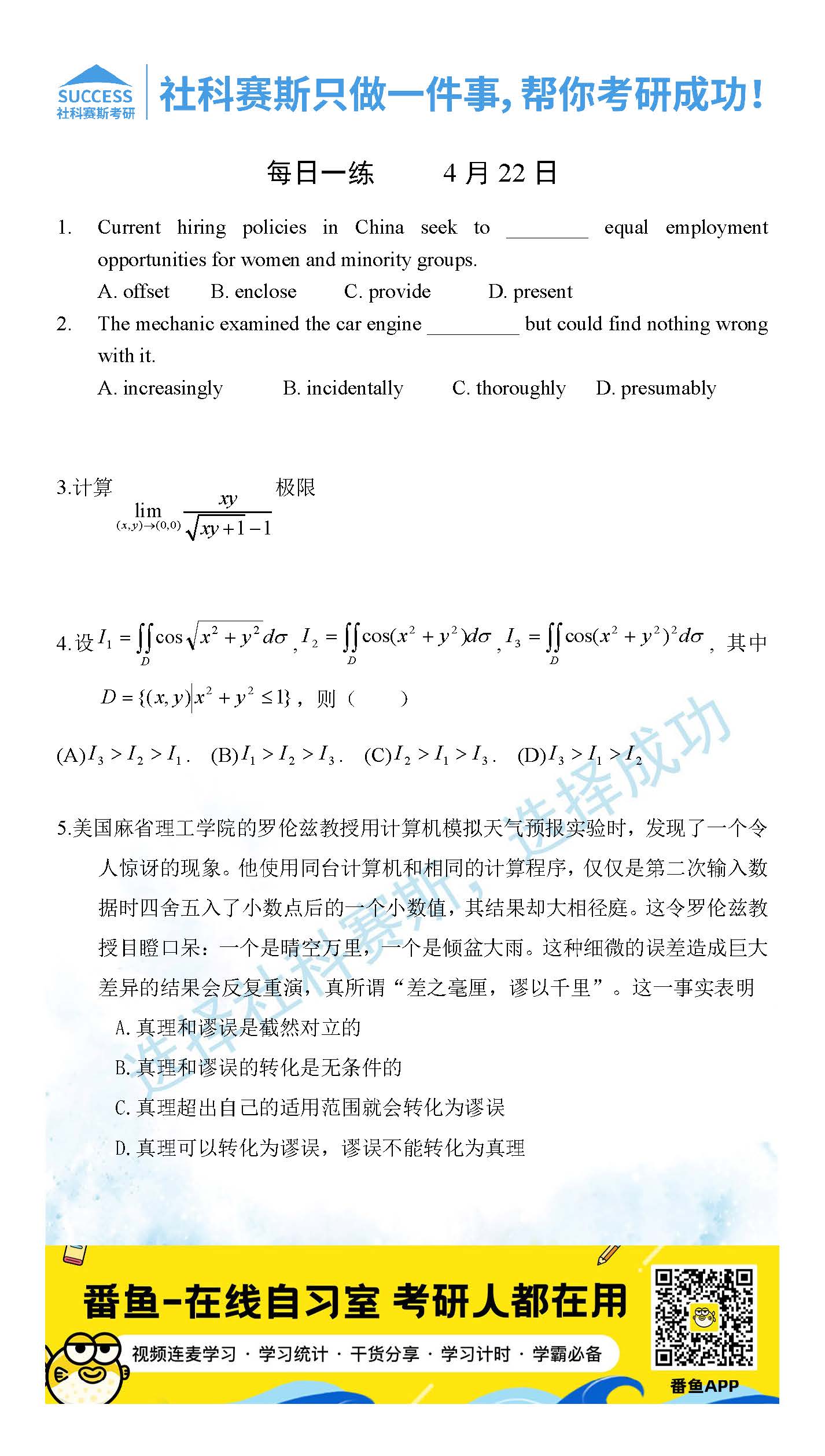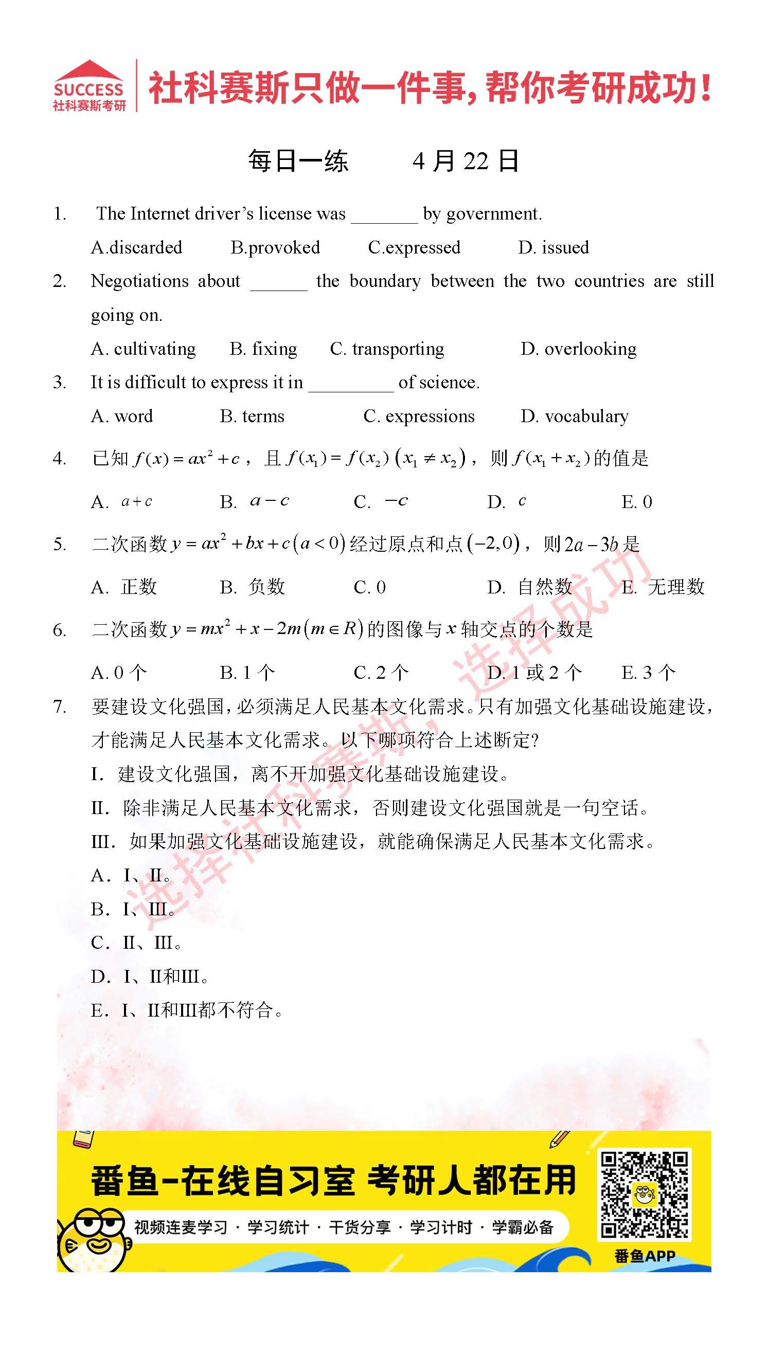 導讀:考研是一場持久戰,保持良好的學習習慣,是能確保復習高效的關鍵。今天社科賽斯MBA備考網小編整理了“2022管理類聯考4月22日每日一練及答案”的內容,希望能對廣大考生有所幫助。