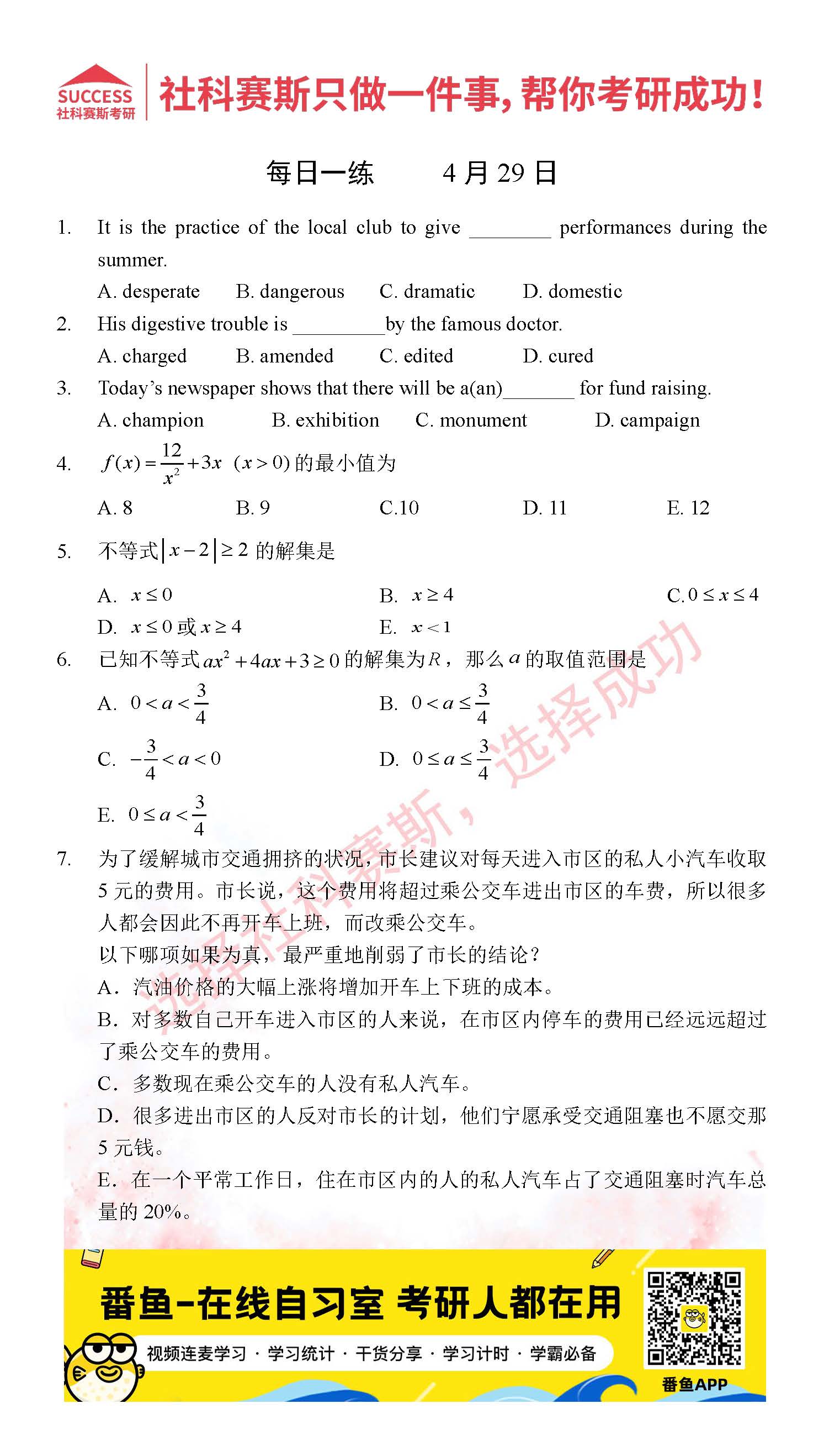 導讀:考研是一場持久戰,保持良好的學習習慣,是能確保復習高效的關鍵。今天社科賽斯MBA備考網小編整理了“2022管理類聯考4月29日每日一練及答案”的內容,希望能對廣大考生有所幫助。