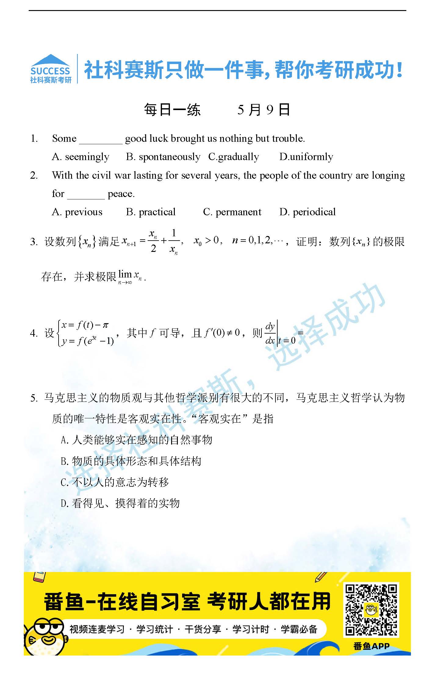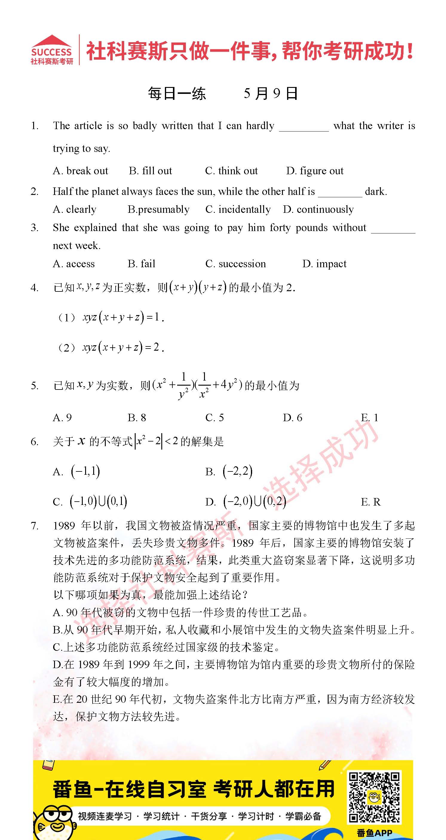 導讀:考研是一場持久戰,保持良好的學習習慣,是能確保復習高效的關鍵。今天社科賽斯MBA備考網小編整理了“2022管理類聯考5月9日每日一練及答案”的內容,希望能對廣大考生有所幫助。