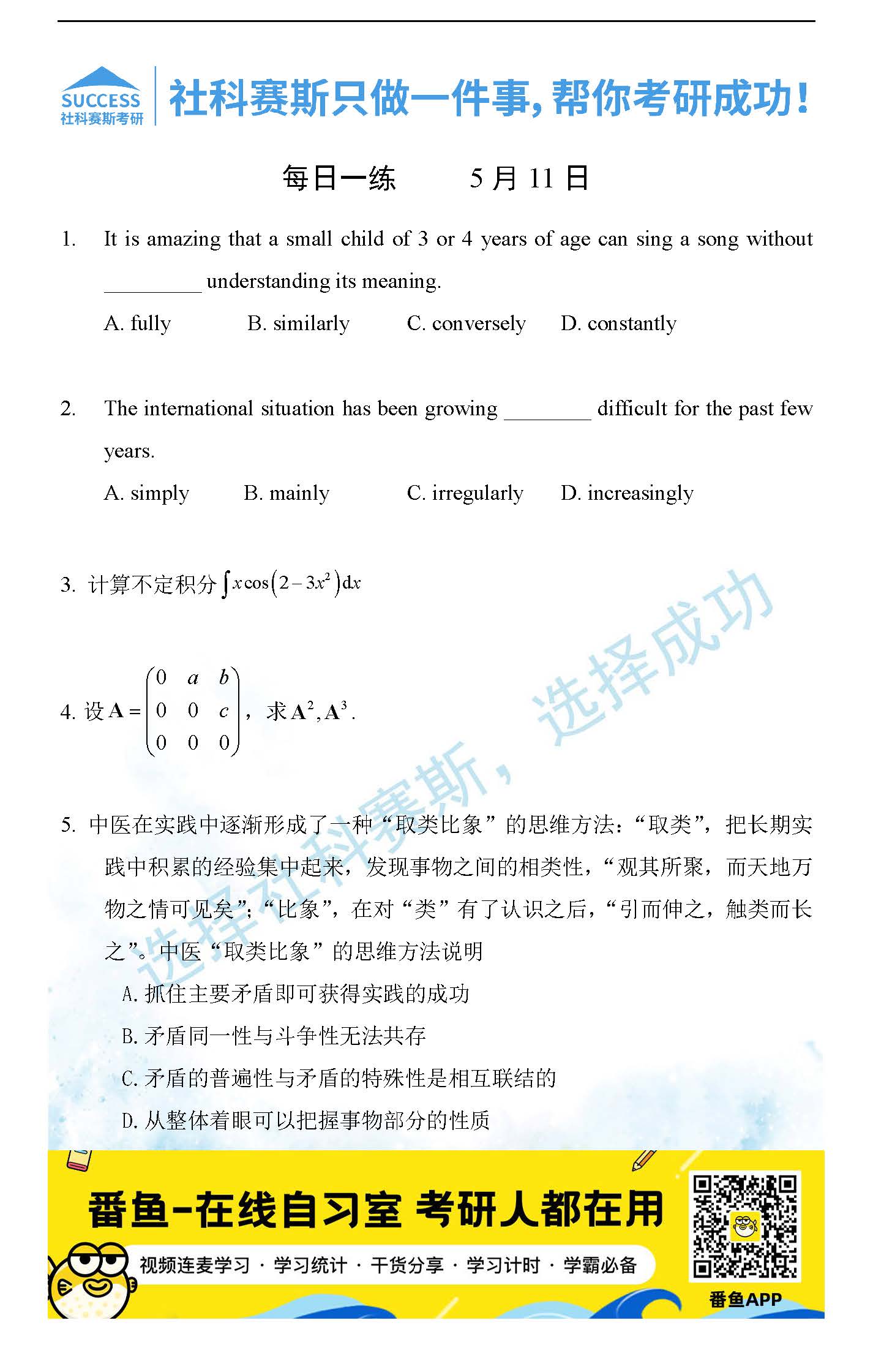 導讀:考研是一場持久戰(zhàn),保持良好的學習習慣,是能確保復習高效的關鍵。今天社科賽斯MBA備考網小編整理了“2022管理類聯(lián)考5月11日每日一練及答案”的內容,希望能對廣大考生有所幫助。