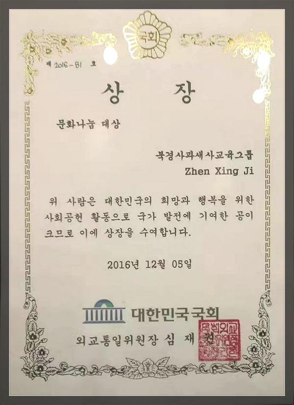 北京社科賽斯科技有限公司董事長甄誠先生獲得大韓民國國會和大韓民國統(tǒng)一委員會頒發(fā)的“大韓民國社會貢獻大獎”,大韓民國國會印章,外交統(tǒng)一委員會委員長簽字。