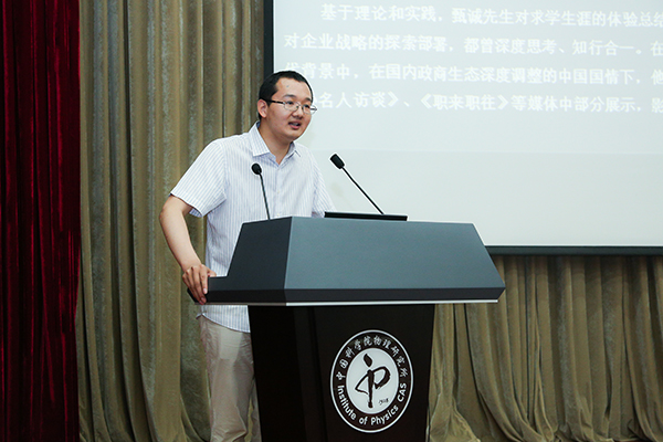 報告前,物理所研究生部王皖燕副主任、處長助理紀海鴻老師、業務主管李軍老師等師生于物理所“IOP咖啡廳”接待甄誠先生一行并出席報告會。物理所現任研究生會主席席薇博士,青年志愿者協會學生會長王彩瑋博士帶領物理所的學生干部組織了本次活動,出席者還包括中科院物理所師生在內的10余家科研院所和相關企業代表共計150余人。