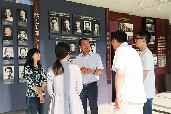王皖燕副主任引導甄誠先生參觀物理所“院士墻”