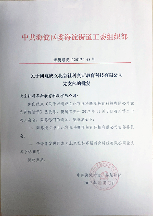 2017年11月15日,北京社科賽斯黨支部成立大會于社科賽斯北京總部隆重舉行,海淀街道工委組織部部長侯永卿、非公企業黨建負責人張廣君、紅帆工作站黨支部書記鐘立德、黨建指導員尚三利、創業公社紅帆工作站站長屠繼東,社科賽斯董事長甄誠、副董事長趙新、校長兼黨支部書記李發進、副校長趙羽,社科賽斯20余名黨員及總部全體員工出席了本次會議。會議由社科賽斯校長兼黨支部書記李發進主持。