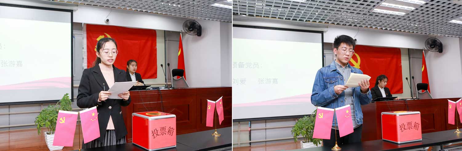 李發(fā)進(jìn)書記宣讀轉(zhuǎn)正結(jié)果:會(huì)議表決通過劉愛、張游嘉轉(zhuǎn)為正式黨員的決議。并對(duì)兩位同志提出期許。他說,希望兩位同志今后無論在思想上還是行動(dòng)上,不僅要積極學(xué)習(xí)黨的先進(jìn)理論知識(shí),還要踐行黨員義務(wù),時(shí)刻以黨員身份要求自身,積極發(fā)揮模范帶頭作用。