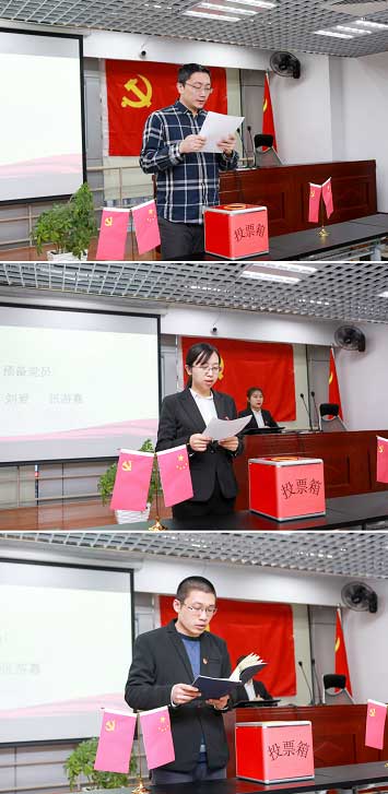 隨后進(jìn)行預(yù)備黨員轉(zhuǎn)正大會(huì)。劉愛、張游嘉兩名預(yù)備黨員分別鄭重地向黨組織匯報(bào)了自身預(yù)備期間的思想情況、工作情況,以端正積極的態(tài)度表達(dá)了轉(zhuǎn)為正式黨員的強(qiáng)烈愿望;入黨介紹人分別就兩位同志預(yù)備期間的表現(xiàn)發(fā)表了意見,組織委員代表支委會(huì)介紹預(yù)備黨員在預(yù)備期的表現(xiàn)情況,肯定成績,指出缺點(diǎn)和不足,提出能否轉(zhuǎn)正的意見;經(jīng)過與會(huì)黨員的充分討論之后,進(jìn)行無記名投票。