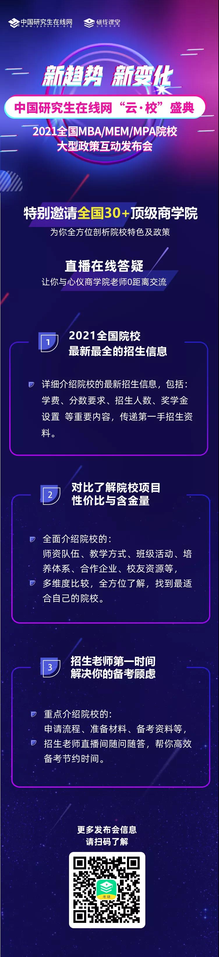為滿足廣大MBA考生對2021招生政策咨詢的需求,建立多方位的信息溝通渠道,研線網(簡稱“研線網”)首次與各大高校合作舉辦“新趨勢、新變化 研線網‘云·校’盛典暨2021全國MBA/MEM/MPA院校大型政策互動發布會”,活動期間將邀請各大高校MBA中心老師講解院校最新政策,歡迎大家前來觀看交流!