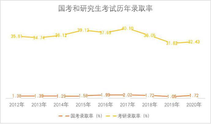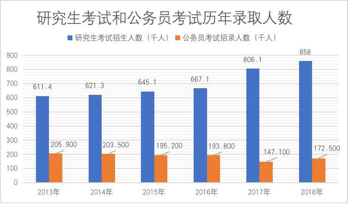近年來,研究生的招生規(guī)模在逐年擴大,2020年的招生規(guī)模預計為110.6萬人,比2011年的56萬人增加了一倍左右,考研黨們“上岸”的可能性更大了。而公務員考試,雖然報考人數(shù)接近研究生考試報考人數(shù)的2倍,但是錄取人數(shù)卻不及研究生考試錄取人數(shù)的四分之一,招錄人數(shù)計劃更呈現(xiàn)出穩(wěn)中有降的趨勢,2019年的國考招錄人數(shù)僅為14,537人,比2018年下降了49%。考公族們“上岸”的希望非常渺茫,更不用說熱門崗位了。