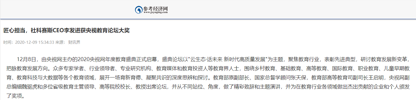 經過近三個月的公示提名,通過網絡票選、專家評審、評委會終審層層篩選之后,社科賽斯CEO李發進榮獲"2020年度|教育行業匠心人物"獎。