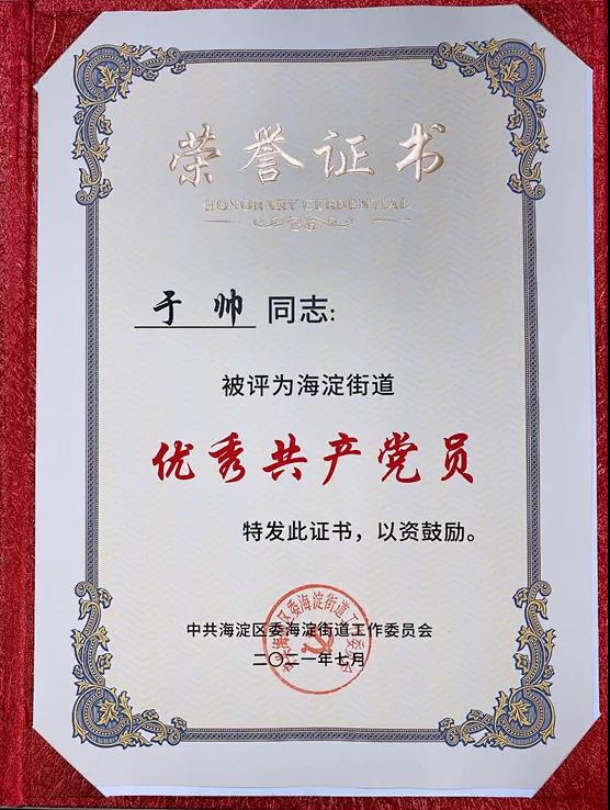 社科賽斯黨支部宣傳委員于帥同志榮獲『海淀街道優秀共產黨員』榮譽稱號;