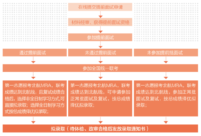 通過考生:第一志愿報考北航MBA,聯考成績達到北航線,復試成績合格,選擇非全日制學習方式可直接擬錄取;選擇全日制學習方式按總成績擇優擬錄取;