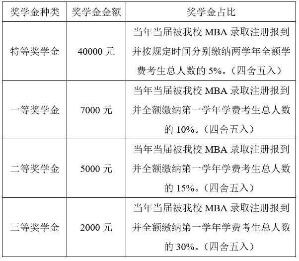 吉林財經大學實行的MBA新生獎學金,特等獎學金金額為肆萬元,覆蓋率及特等獎學金占整體學費的比率均居吉林省MBA招生院校之首。凡被我校工商管理碩士(MBA)專業錄取,注冊并全額繳納學費到我校的考生均可參評。