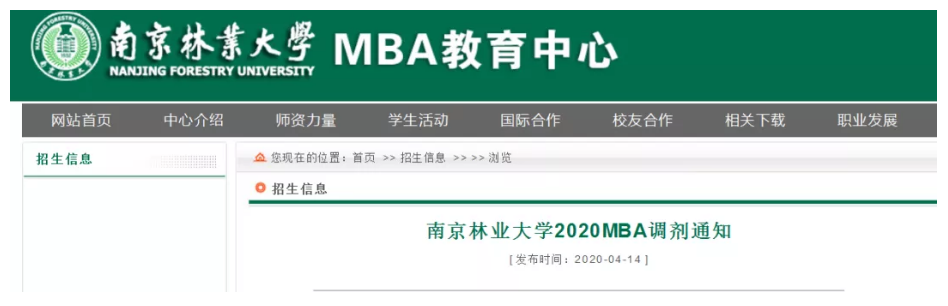 根據(jù)南京林業(yè)大學(xué)學(xué)科建設(shè)與學(xué)位點發(fā)展的需要,我校工商管理碩士(MBA)專業(yè)目前還有部分調(diào)劑名額,接收2020年校外調(diào)劑考生,請有意向調(diào)劑到南京林業(yè)大學(xué)攻讀MBA學(xué)位的考生按照以下要求辦理調(diào)劑事宜。