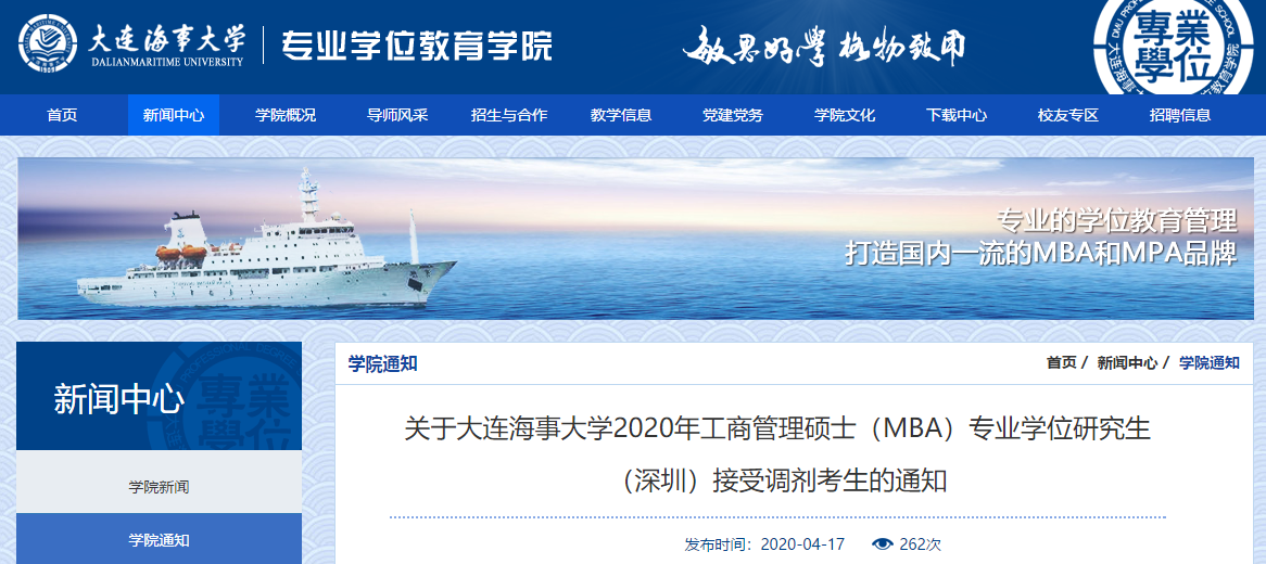 根據教育部公布的2020年全國碩士研究生招生考試國家分數線和大連海事大學2020年碩士研究生招生計劃,結合第一志愿報考我校考生的初試情況,我校MBA(深圳)(“大連海事大學2020年非全日制碩士研究生招生專業目錄”中工商管理[125100]專業56——59研究方向)尚有部分空缺名額,接受考生調劑,歡迎廣大符合教育部規定MBA的報考條件、初試成績達到國家A類地區管理類聯考初試分數線,且有意向調劑到我校的考生,通過電話和郵件等方式與我校建立聯系。