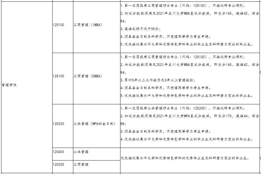 以上就是小編整理“2021MBA調劑:蘭州大學2021年IMBA/EMBA/MPA調劑需求信息”的全部內容,想了解更多調劑信息,請持續(xù)關注本網(wǎng)站。