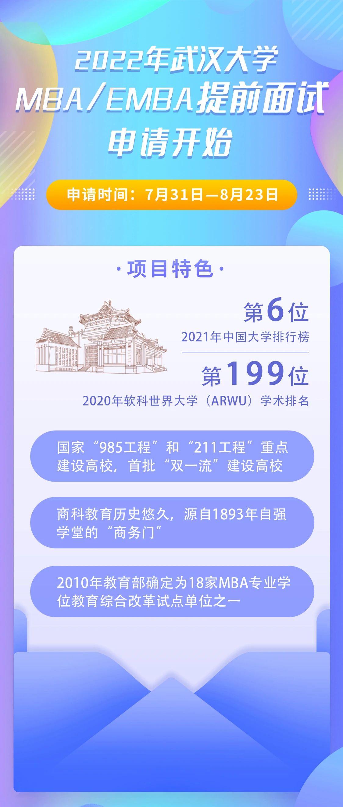 原文標(biāo)題:提面報(bào)名 | 2022年武漢大學(xué)工商管理碩士(MBA、EMBA)提前面試申請(qǐng)開始!