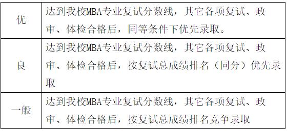 面試結果分為:優、良和一般。優:預面試分數為85分以上且不超過預面試考生比例35%;良:預面試分數70分以上;合格:預面試分數60分以上。MBA擬錄取資格對照表如下: