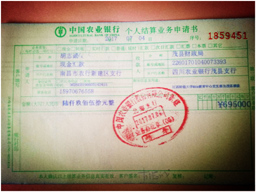 導(dǎo)讀: 2017年7月6日,四川省茂縣財政局在當(dāng)?shù)卣W(wǎng)站上貼出了《關(guān)于接受社會愛心捐款情況的公示》(http: www maoxian gov cn xxgk gsgg 201707 t20170706_1252365 html),江西財經(jīng)大學(xué)MBA教育中心黨支部轉(zhuǎn)款的6,950 00 元是四川茂縣疊溪鎮(zhèn)新磨村新村組山體高位垮塌災(zāi)情發(fā)生后,茂縣財政局接受捐款賬號收到的第925筆捐款。