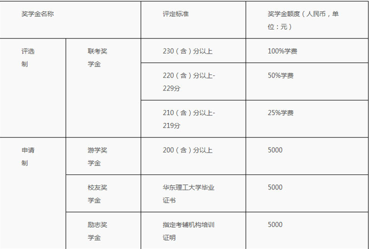 校友獎學(xué)金:第一志愿報考華東理工大學(xué)2018年MBA并被錄取,考生在規(guī)定時間段提出申請并提供華東理工大學(xué)畢業(yè)證書后評定。