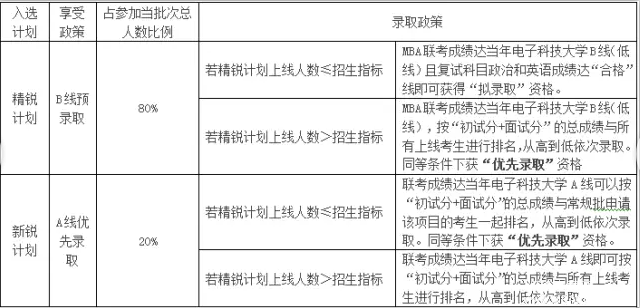 (1)入選精銳計劃且當年第一志愿報考電子科技大學MBA(英語、綜合兩科均有成績)的考生,聯考成績若未達到我校B線,該“B線預錄取”資格可保留至第二年。