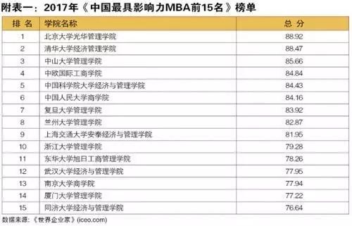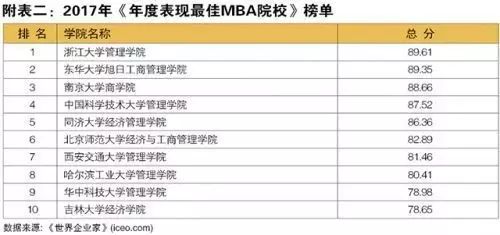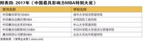 其中,2017年《中國最具影響力MBA特別大獎》和《年度表現最佳MBA院校》,或許給很多人拓寬了選擇方向,比如最具社會責任MBA:中山大學管理學院、最具跨國公司贊賞MBA:北京大學光華管理學院等。