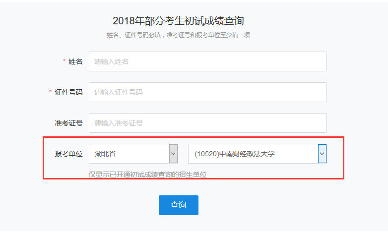 以下是中南財經政法大學,2018年全國碩士研究生考試成績查詢入口(https://yz.chsi.com.cn/apply/cjcx/)