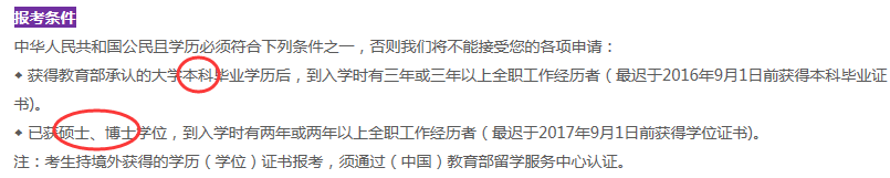 對(duì)MBA有所了解的同學(xué)都知道,MBA報(bào)考條件中有一條是對(duì)學(xué)歷和畢業(yè)年限的要求,具體如下:本科畢業(yè)3年及以上,碩士博士畢業(yè)2年及以上,專(zhuān)科畢業(yè)5年及以上。