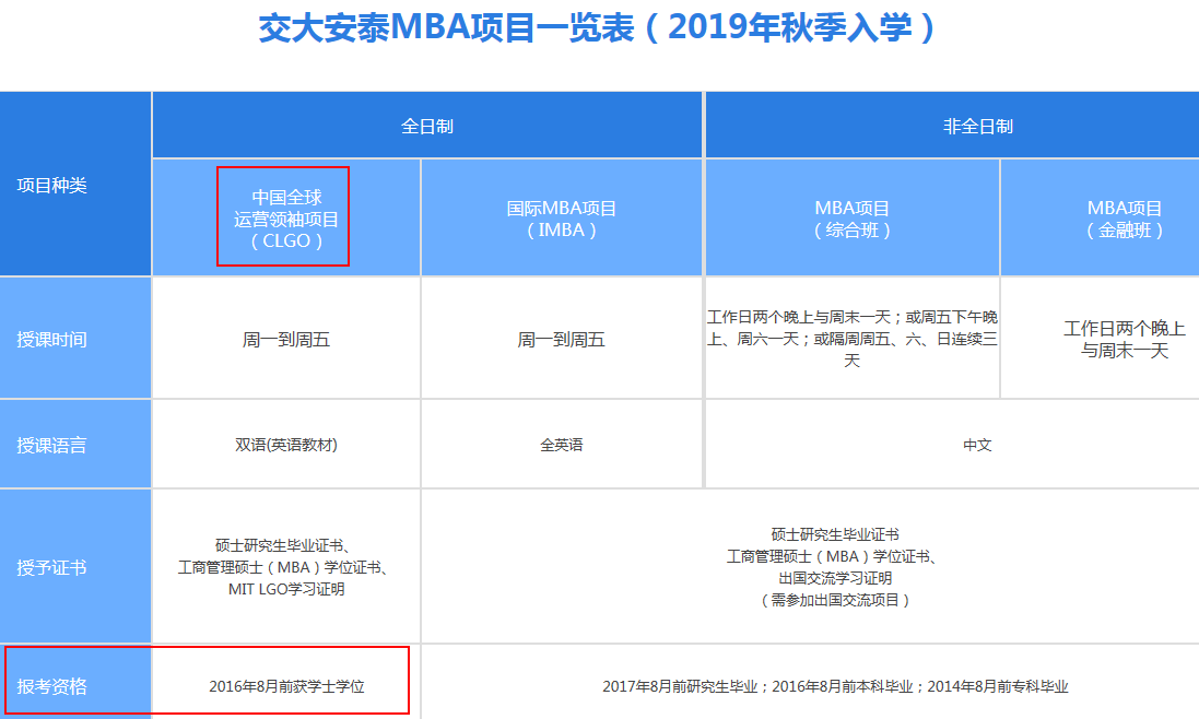交大安泰全日制中國(guó)全球運(yùn)營(yíng)領(lǐng)袖項(xiàng)目CLGO報(bào)考資格為本科及以上,其余三個(gè)項(xiàng)目專(zhuān)科可申請(qǐng),具體說(shuō)明如下: