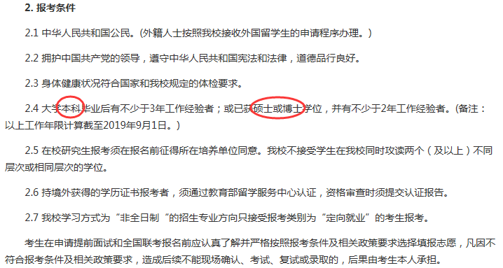 對(duì)于專(zhuān)升本、成人本科、半工半讀取得自考本科學(xué)歷的同學(xué),本科畢業(yè)后到入學(xué)前有三年或三年以上工作經(jīng)驗(yàn)也可以報(bào)考,但從往年數(shù)據(jù)可看出錄取占比非常低。