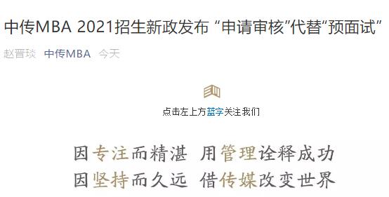 以上就是“中傳MBA2021招生新政發布: “申請審核”代替“預面試”“的全部內容了,想報考中傳MBA的同學們要抓緊準備了,祝大家申請順利!