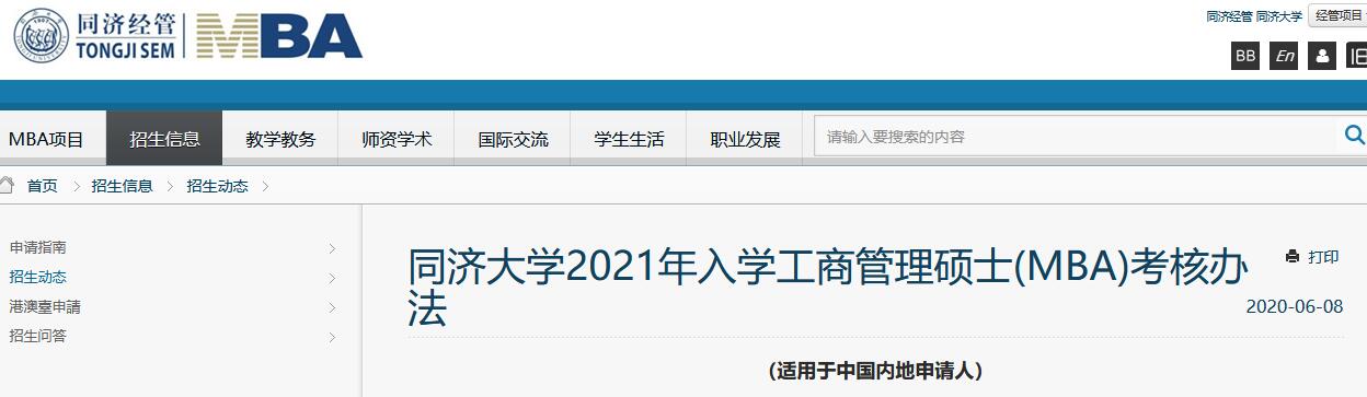 同濟大學2021年入學工商管理碩士(MBA)考核辦法