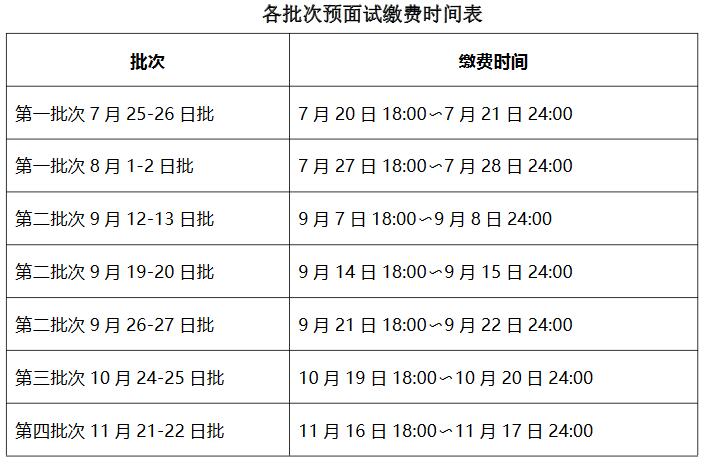 考生需根據(jù)《各批次預(yù)面試繳費時間表》中對應(yīng)的時間,按照系統(tǒng)提示繳納預(yù)面試費,預(yù)面試費標準為90元/人次。繳費后因各種原因未參加預(yù)面試者,已支付的預(yù)面試費不予退還。規(guī)定時間內(nèi)未繳費者,視為放棄預(yù)面試資格。