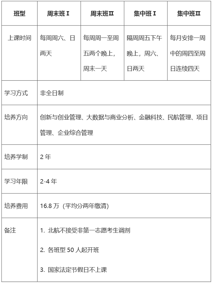 答:北航MBA招生計劃為非全日制,分為6個培養方向、四種上課班型。